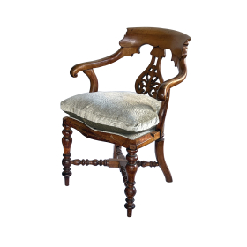the incurved backrest above a pierced vasi-form splat; above a serpentine seat fitted with a loose cushion; all raised on turned legs joined by a turned stretcher; warm patina with overall age and wear; newly upholstered in a celadon cut velvet fabric
