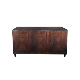 the handsome credenza by John Stuart with its simple, straightforward design constructed of richly-patinated and well-figured tiger mahogany; the rectangular top above a conforming body fitted with three doors faced with beautiful bookmatch veneer opening to reveal four oak-lined drawers with mahogany fronts; all raised on tapering quadrangular supports; good vintage condition with small areas of replaced veneer; professionally refinished; upper right interior drawer replaced.