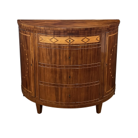 the half-round top over a conforming base inlaid with satinwood inlay and ebony stringing; fitted with four drawers flanked by two hinged doors; raised on short tapering legs; paper label 'Han Larsen, Kallundborg, Kjobenhavn'; good antique condition with minor replacements; refreshed finish