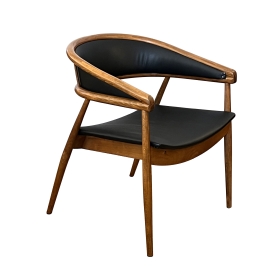 of sleek mid-century design with an elegant profile, James Mont's King Cole chair was deigned for one of his most notable commissions, the King Cole Penthouse in Miami; having a beech bentwood openwork barrel back with sloping arms all above a saddle seat and conforming apron; raised on tapering turned supports; professionally restored and structurally sound; refinished and reupholstered in black leather