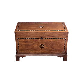 the hinged rectangular lid resting on a conforming body flanked by wrought iron handles; adorned on all sides with an exotic wood inlaid perimeter band inset with bone inlay; the front, top and back centering a pinwheel motif; all resting ona later stand; good antique condition with professionally refinished surface; warm honey-color patina with overall wear; lock mechanism now lacking