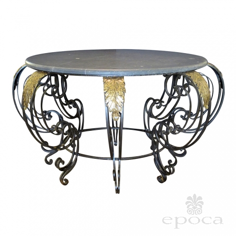 a curvaceous french rococo style wrought-iron circular center table with gray marble top