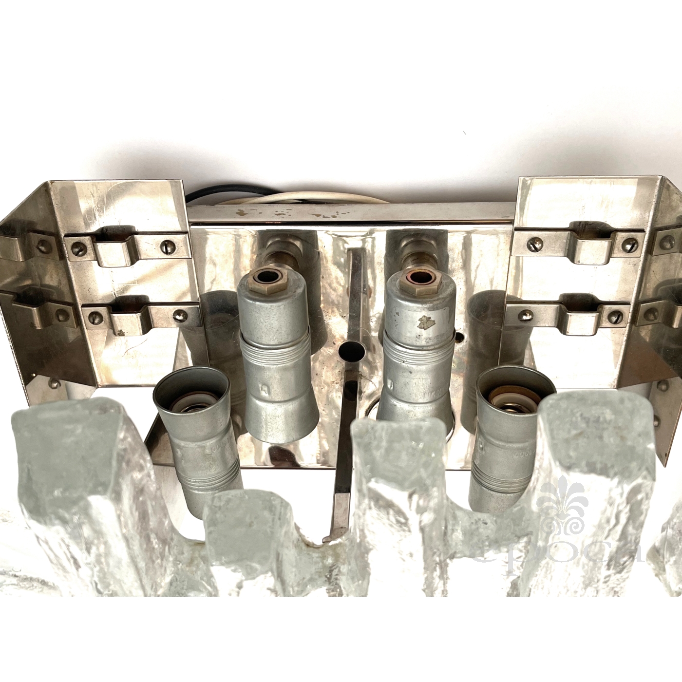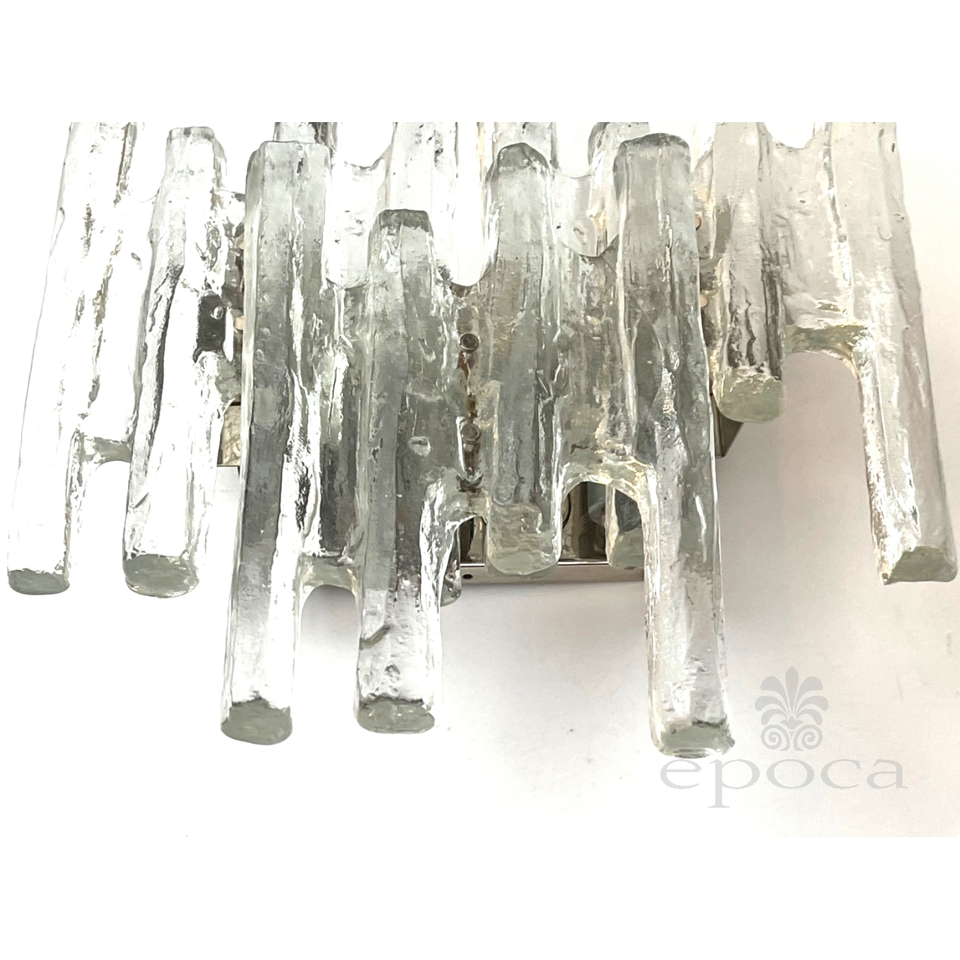 each with chrome back plate fitted with three glass "ice block" shaped elements of radiating form; the two outer elements are removable; professionally rewired; excellent condition with no chips or cracks; some patina to chrome