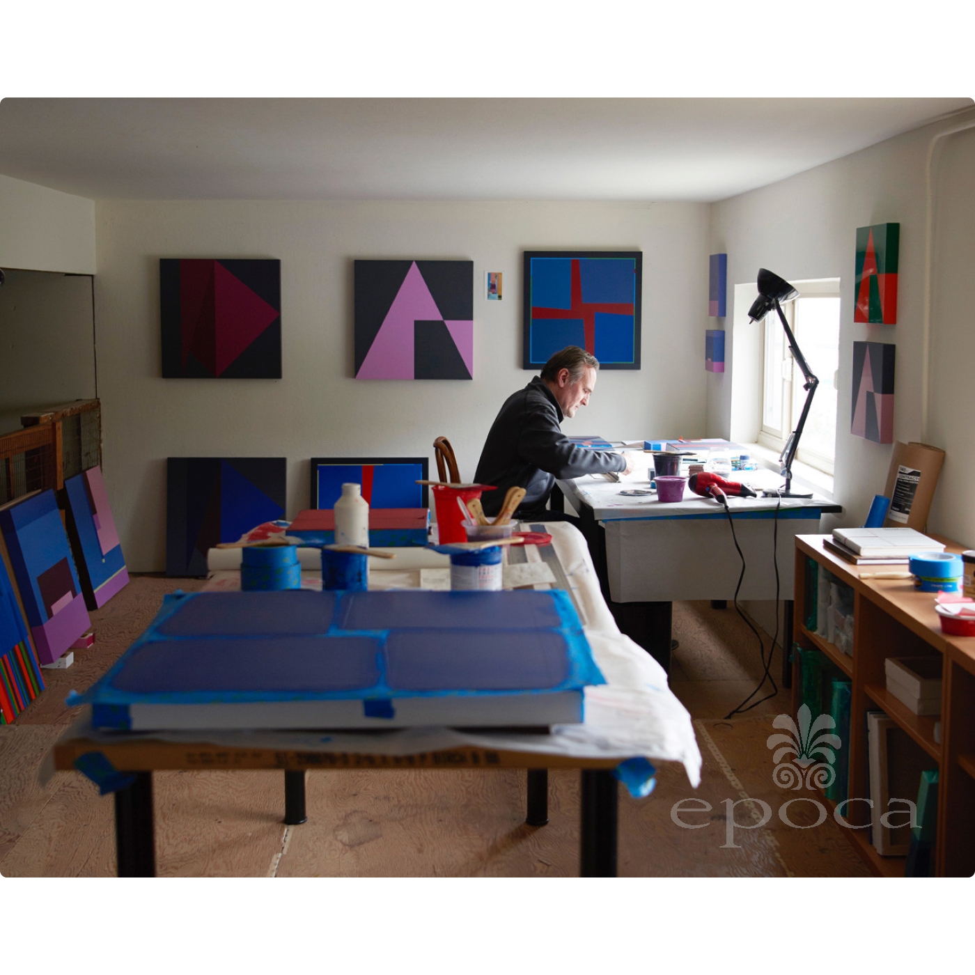 I like reflected light. As with architecture, painting is activated by light. I paint on highly sanded and primed wood panels. Their smooth, hard surfaces aid in reflecting light. I use combinations of matte and gloss acrylic paint to create a tension with light reflecting and absorbing between colorful forms. Pigment reacting to light. The majority of my paintings are square. I use the resisting forces of the four sides of the painting as a catalyst for composition and color relationships. These forces are an energy which can be stronger or weaker depending upon the resonance within the painting. This resonance between the color and form creates a sense of depth, and the edges of the painting act as a boundary which contains or recedes.Space, light, color, and form. My paintings explore these fundamental elements which are essential in both painting and architecture.