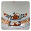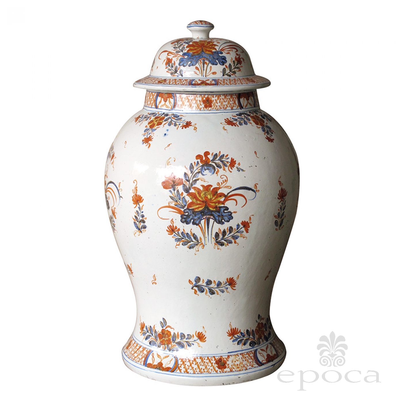 the domed lid with finial knob resting on a bulbous body tapering to the base with a flared foot; painted overall with blue and rouge-de-fer floral clusters within diaper perimeter bands; The historic production of Faenza majolica is recognized worldwide as one of the highest moments of artistic creativity expressed through pottery. The tradition was born from a convergence of favorable conditions: a territory rich in clay, a centuries-old history of political and commercial relations with nearby Tuscany (especially with Florence); minor chipping to rim, underside of lid and base; good antique condition with no repairs or cracks