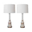 each with long columnar neck above a bell-shaped body adorned with gilt banding and bold greek key motif; excellent condition with minor wear; rewired; new lampshades as is.