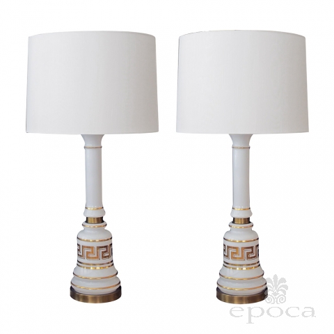 a stylish pair of american 1960's baluster-form white opaline glass lamps with gilt greek key design