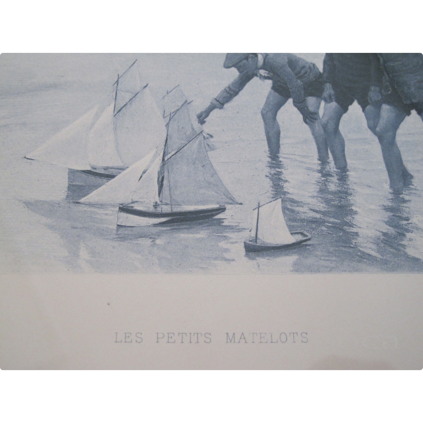 a charming french photogravure print of four boys sailing pond boats; titled 'les petits matelots' by the artist aublet, dated 1891