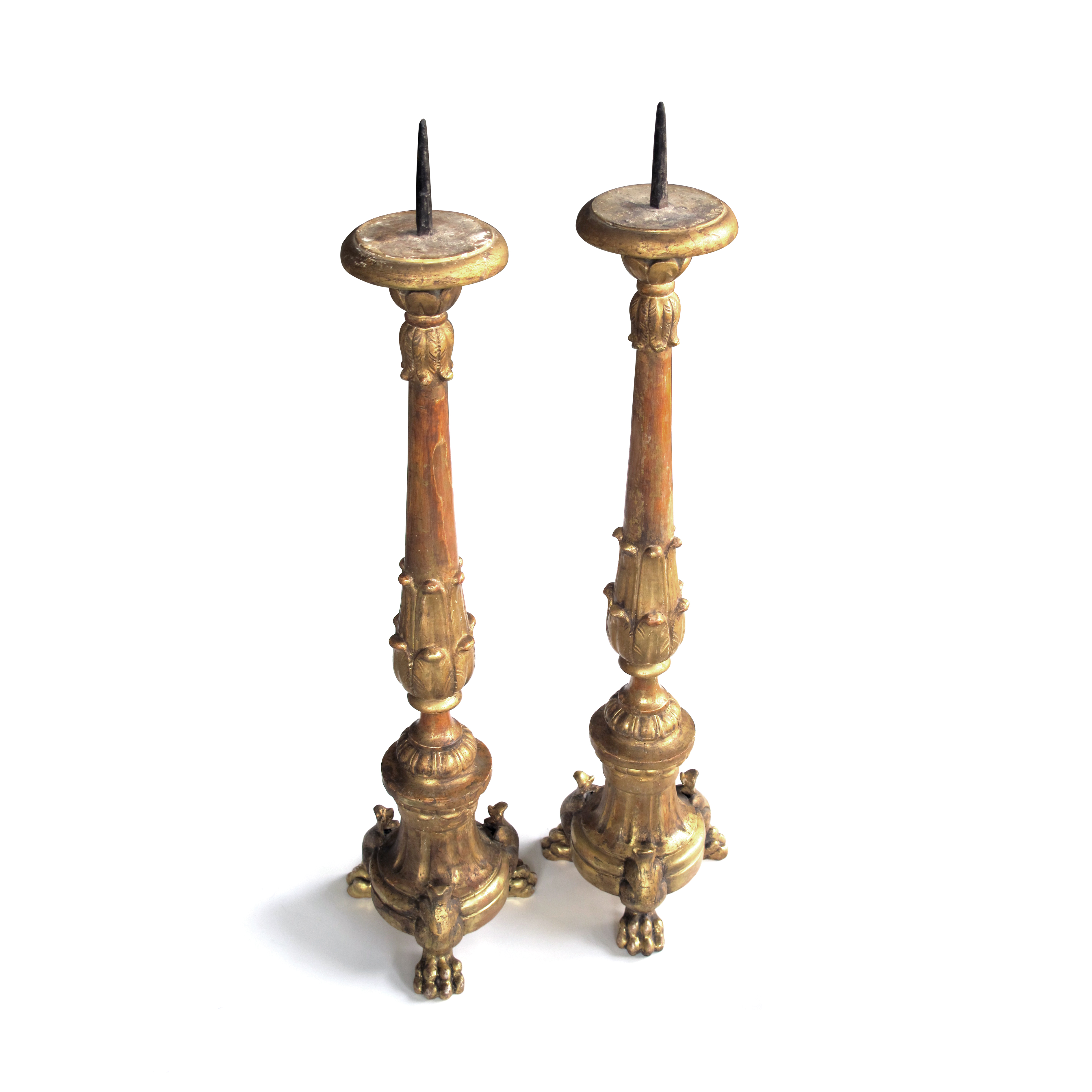 a good quality and large pair of italian baroque style giltwood tripod pricket sticks