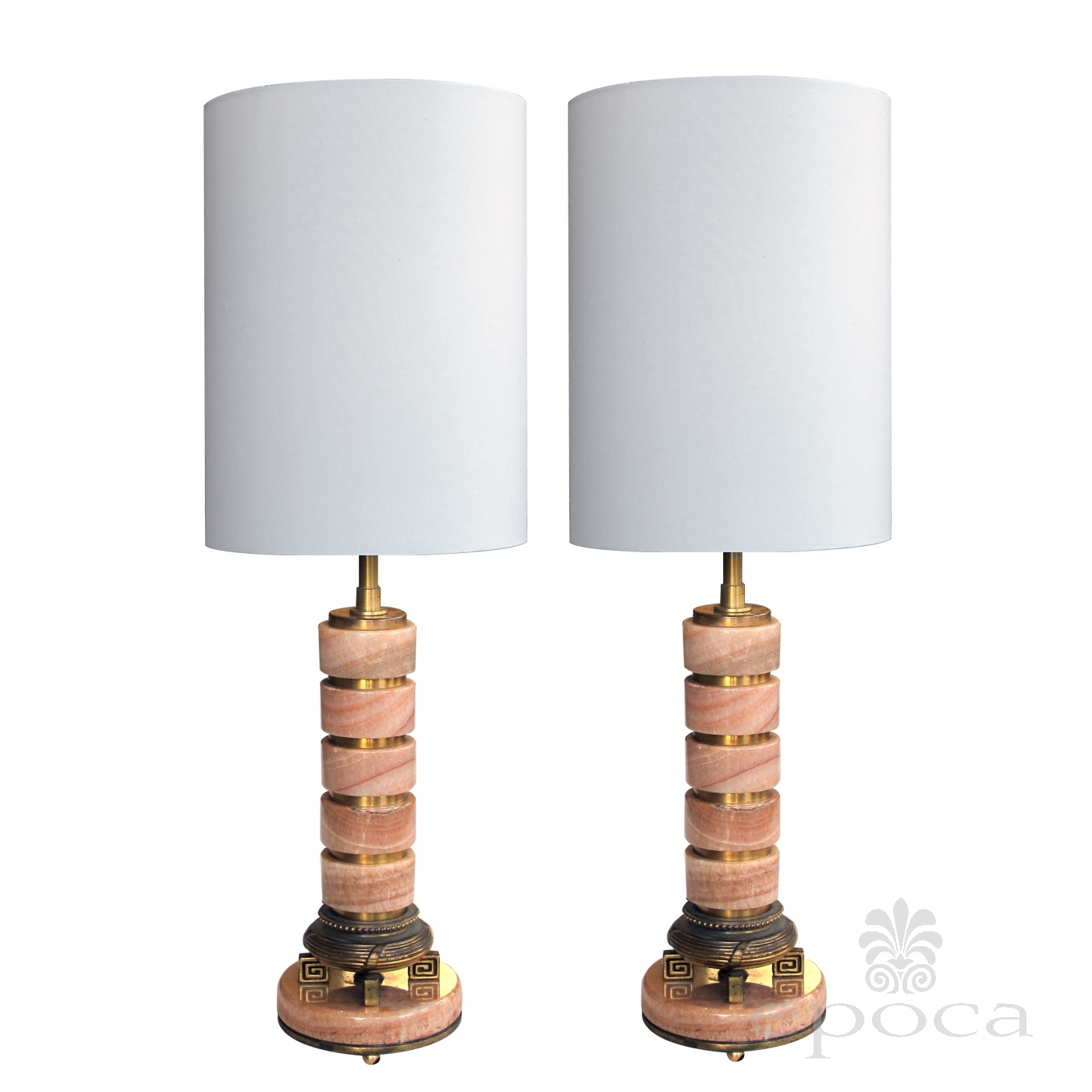 each column of alternating marble and brass discs; raised on 4 Greek key feet; rewired; excellent condition; some rubbing to metal.