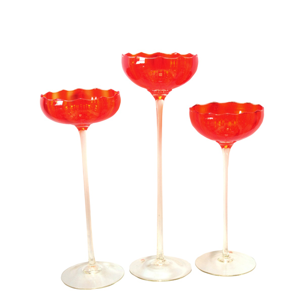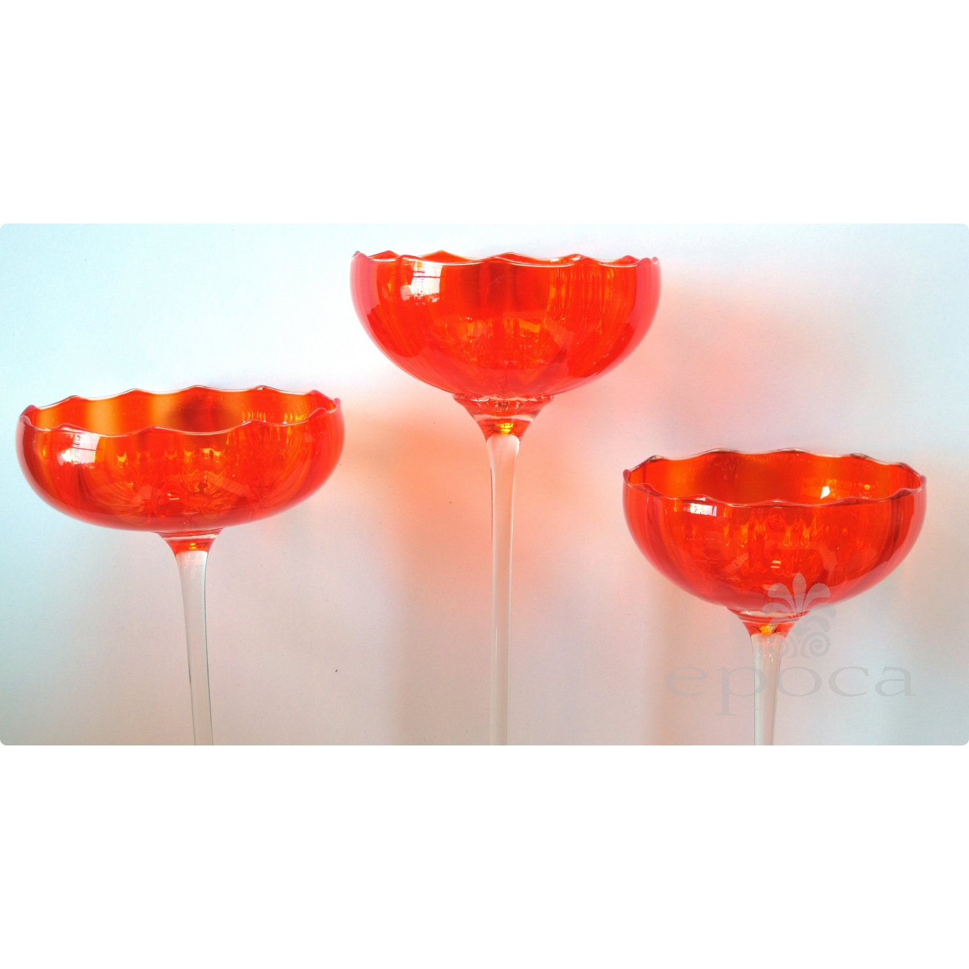 of varying heights, each with ruffled cup of striking orange glass; raised on clear glass stems; with foil labels; excellent condition with no chips or cracks