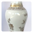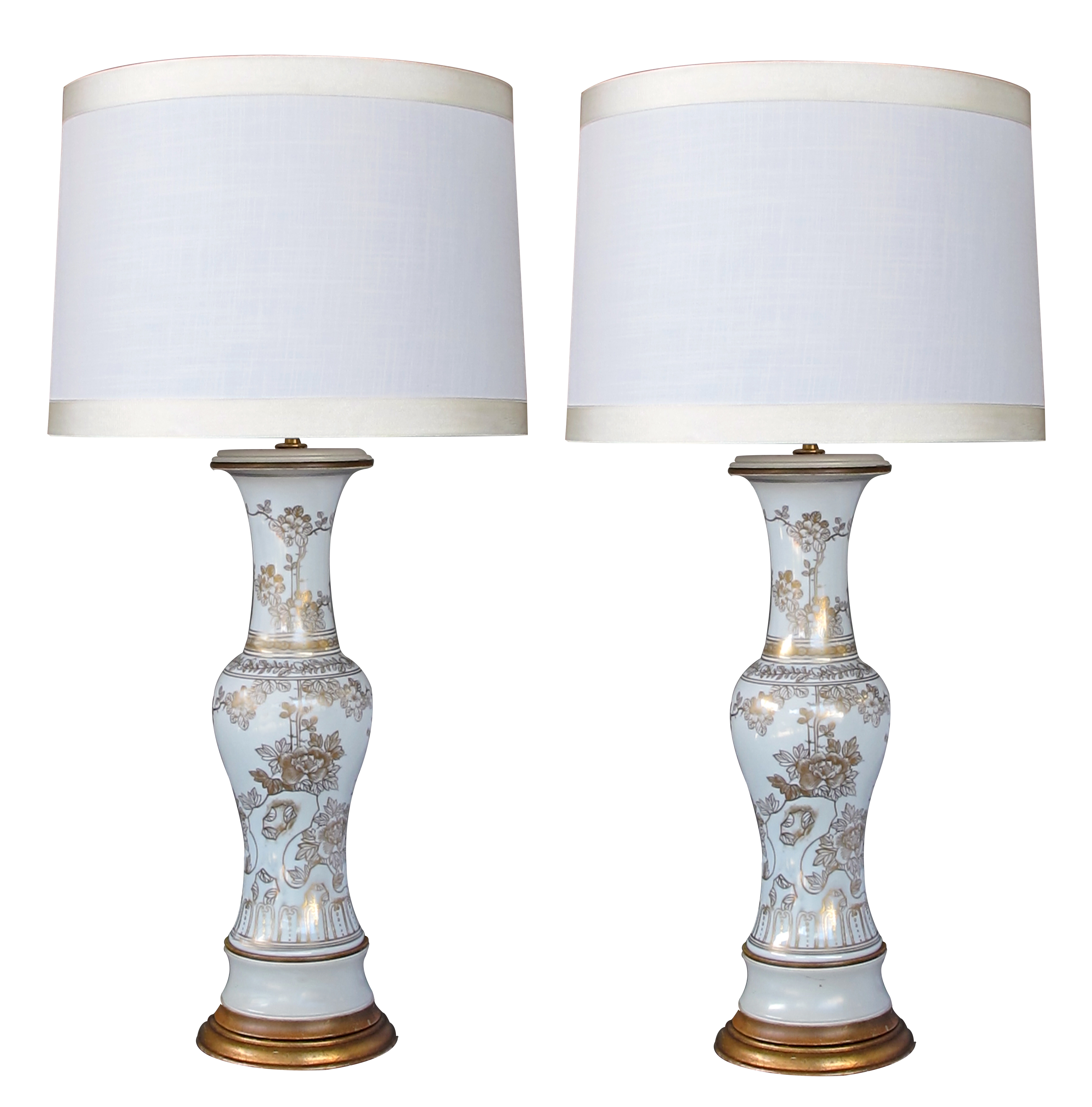 one of the prettiest pairs of chinese lamps that we have had in our inventory; each of slender baluster form adorned with gilt meandering floral vines; raised on a turned giltwood base; excellent condition with minor even wear; rewired
