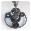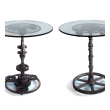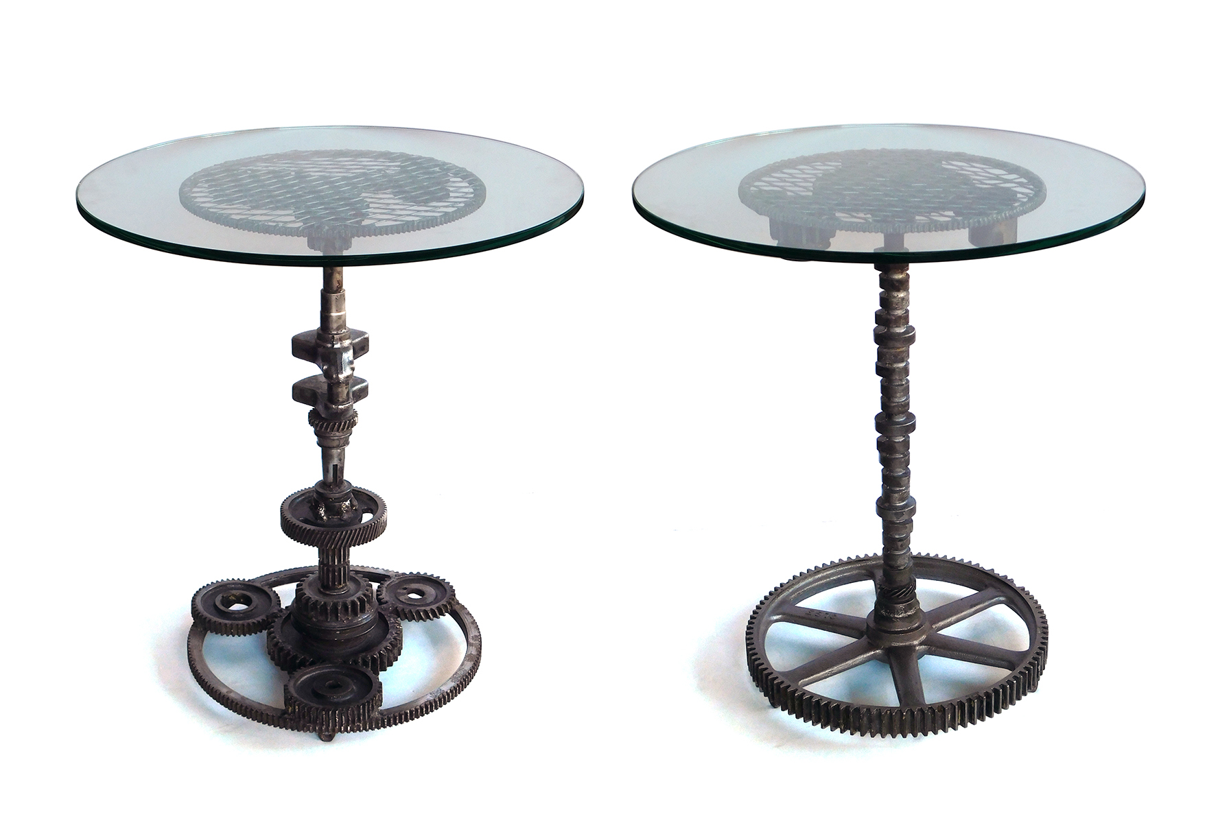 each assembled one-of-a-kind table composed of iron gear wheels and cogs; fitted with glass tops; good condition; professionally cleaned and sealed
