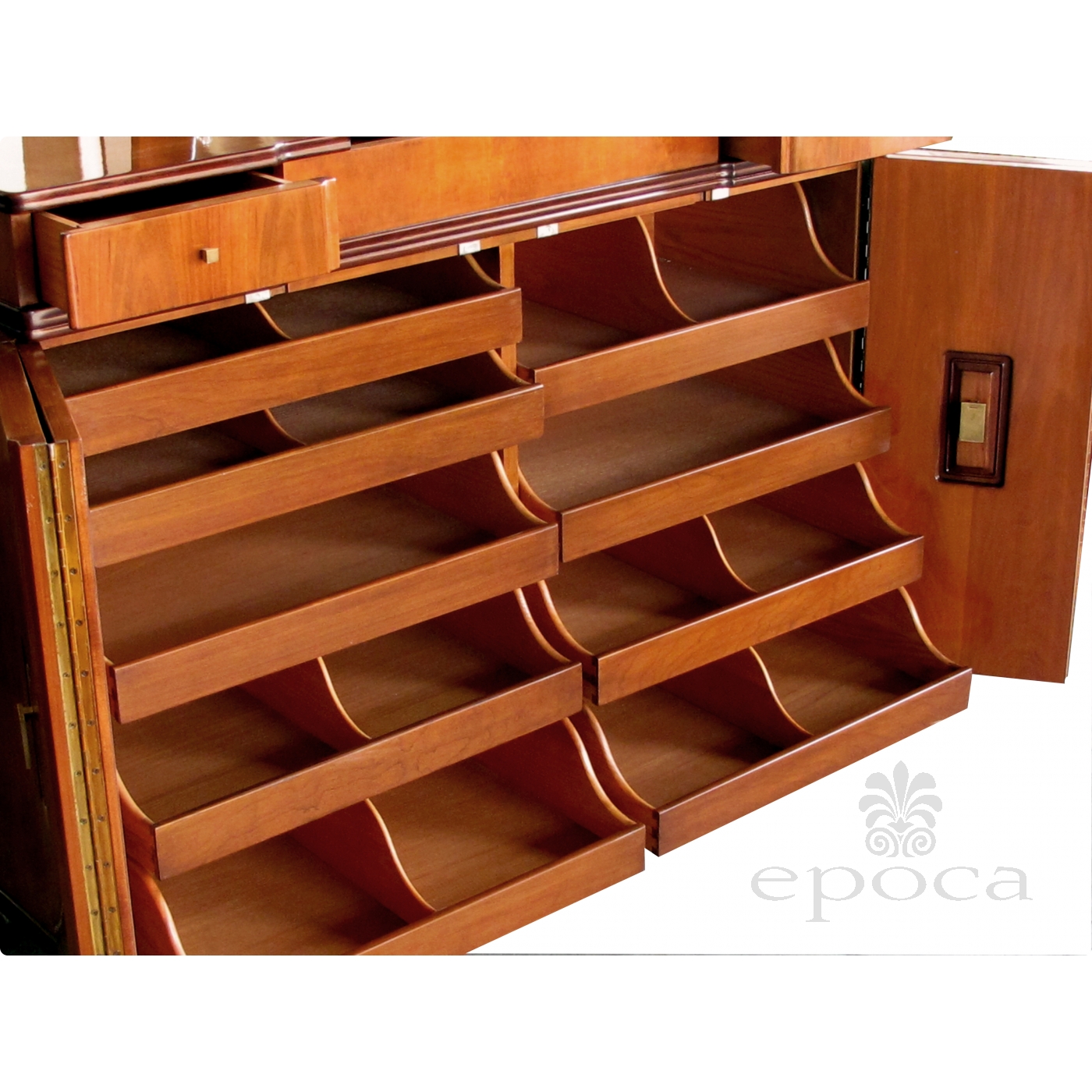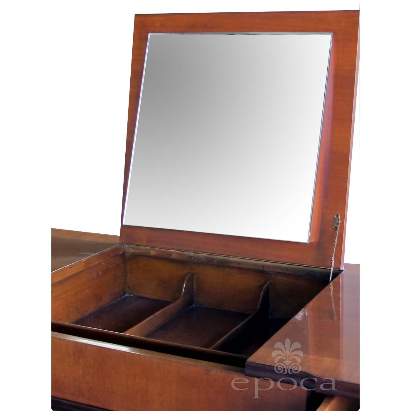 this incredibly stylish and practical dressing cabinet having a hinged top with interior mirror and divided compartments; above a shaped front with two bi-fold doors with interior drawers; the upper section with two small drawers; excellent restored condition; stamped 'John Widdicomb, Grand Rapids'