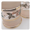 each with shaped lid over a cylindrical body all in alternating clear and frosted glass with hand-painted foliate perimeter bands with gilt highlights; overall even wear with rubbing to gilded surface; no chips or cracks; foliate bands of different hues