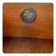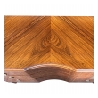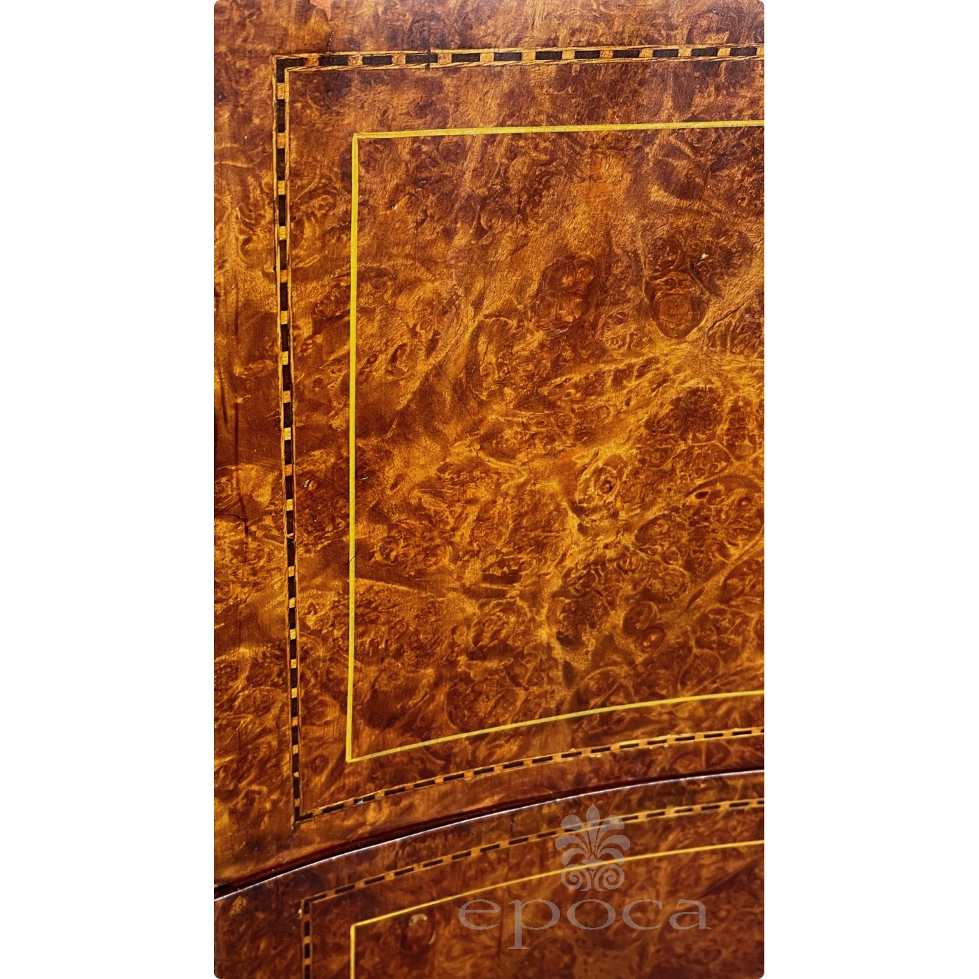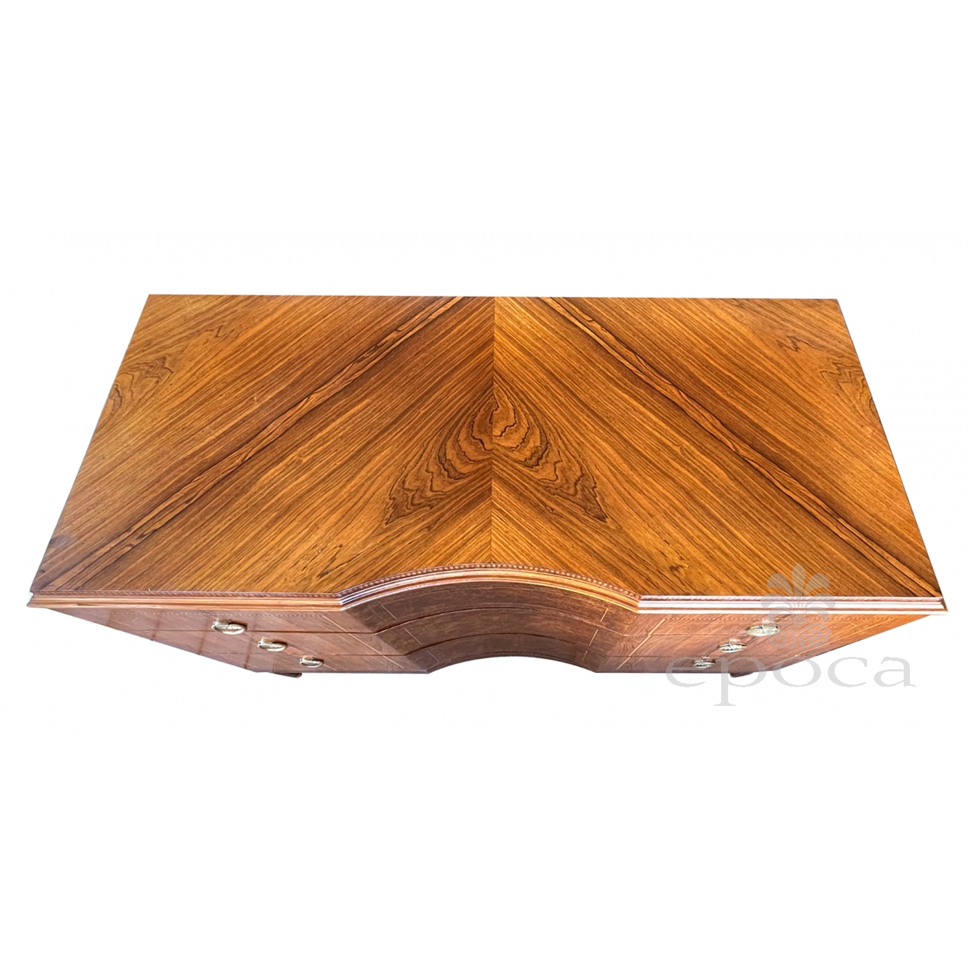 the meticulously crafted chest with book-match veneered rosewood rectangular top with concave front; above three similarly veneered drawers fitted with shell-form enameled pulls, centering well-figured walnut burl wood panels; raised on inlaid turned supports; with metal identification label "Robert W. Irwin, Grand Rapids"; excellent condition with refreshed finish; some rubbing to enameled pulls