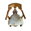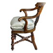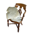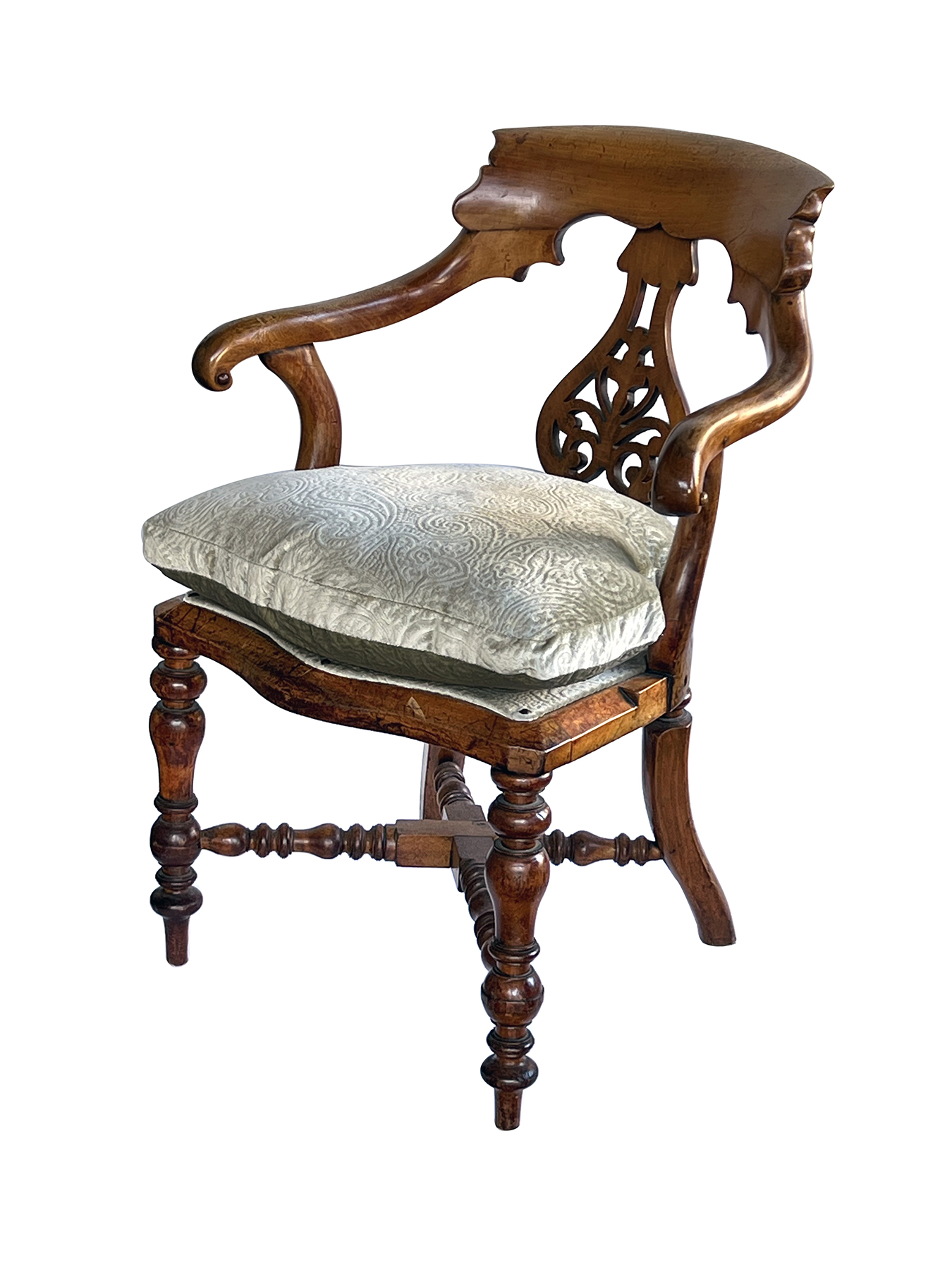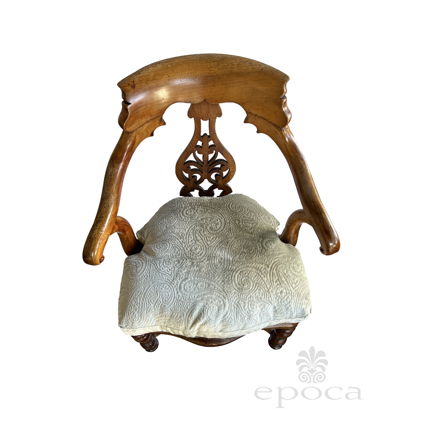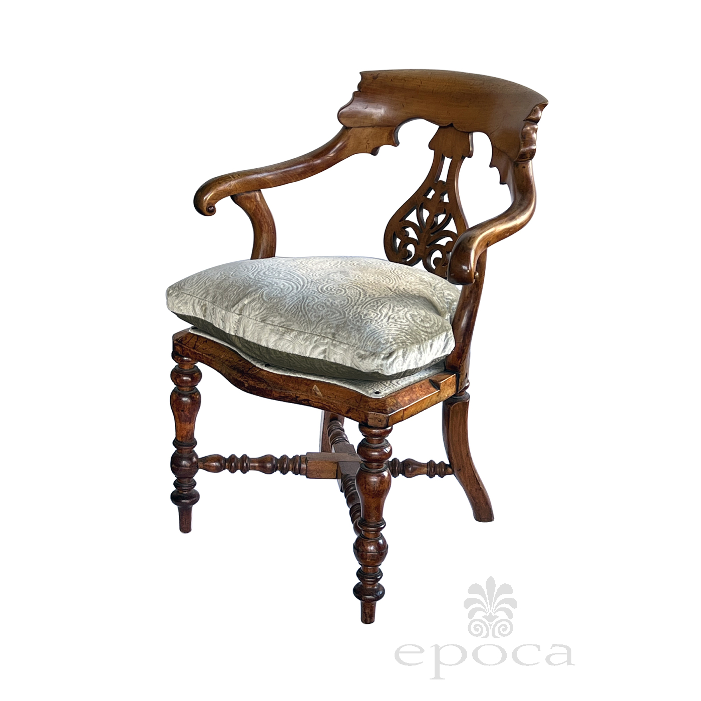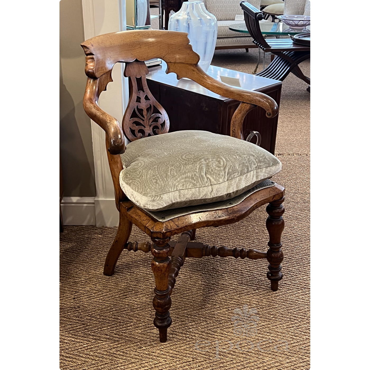the incurved backrest above a pierced vasi-form splat; above a serpentine seat fitted with a loose cushion; all raised on turned legs joined by a turned stretcher; warm patina with overall age and wear; newly upholstered in a celadon cut velvet fabric