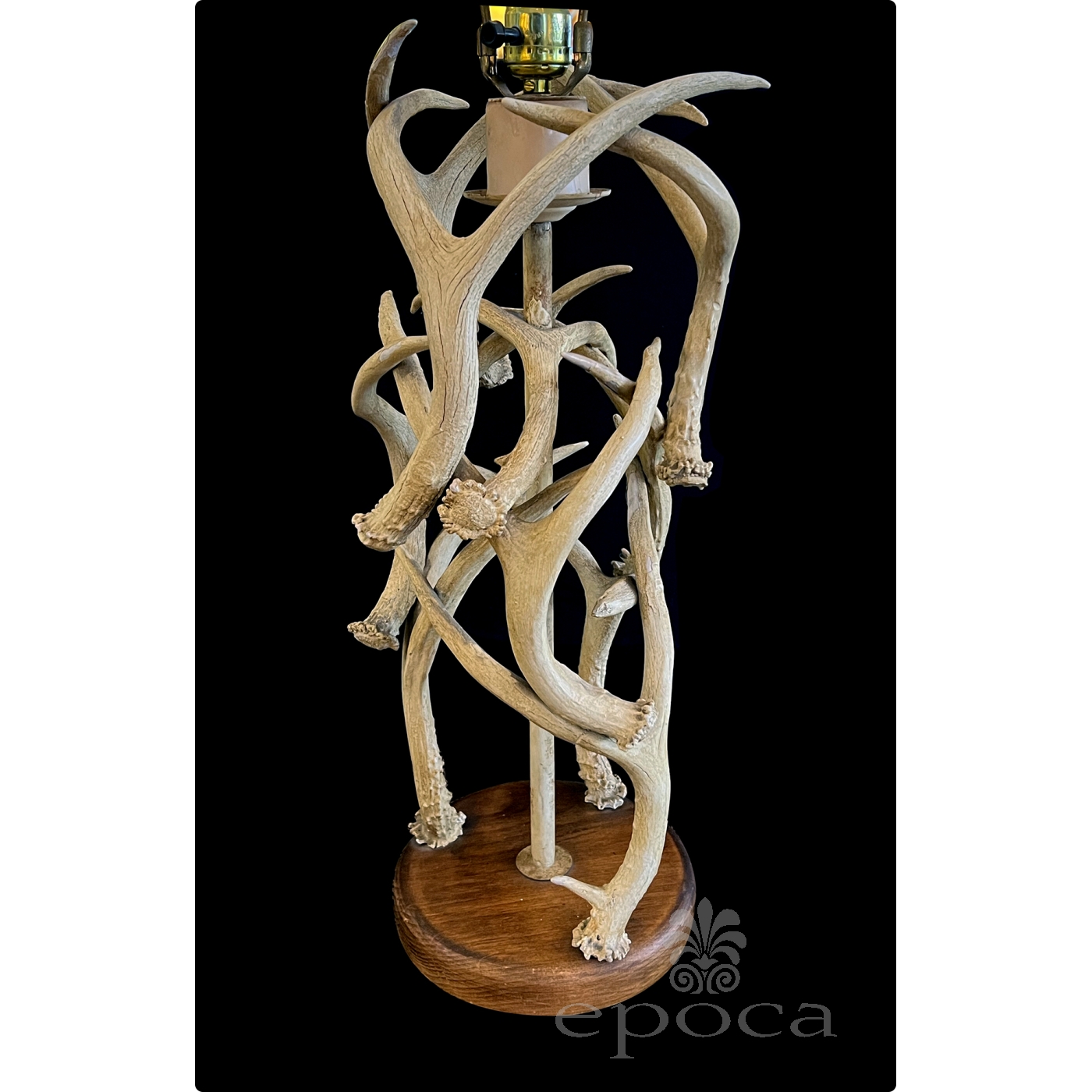 composed of interlocking antlers resting on a circular wooden base; general marks, rubbing and wear; antlers painted with some chipping; professionally rewired