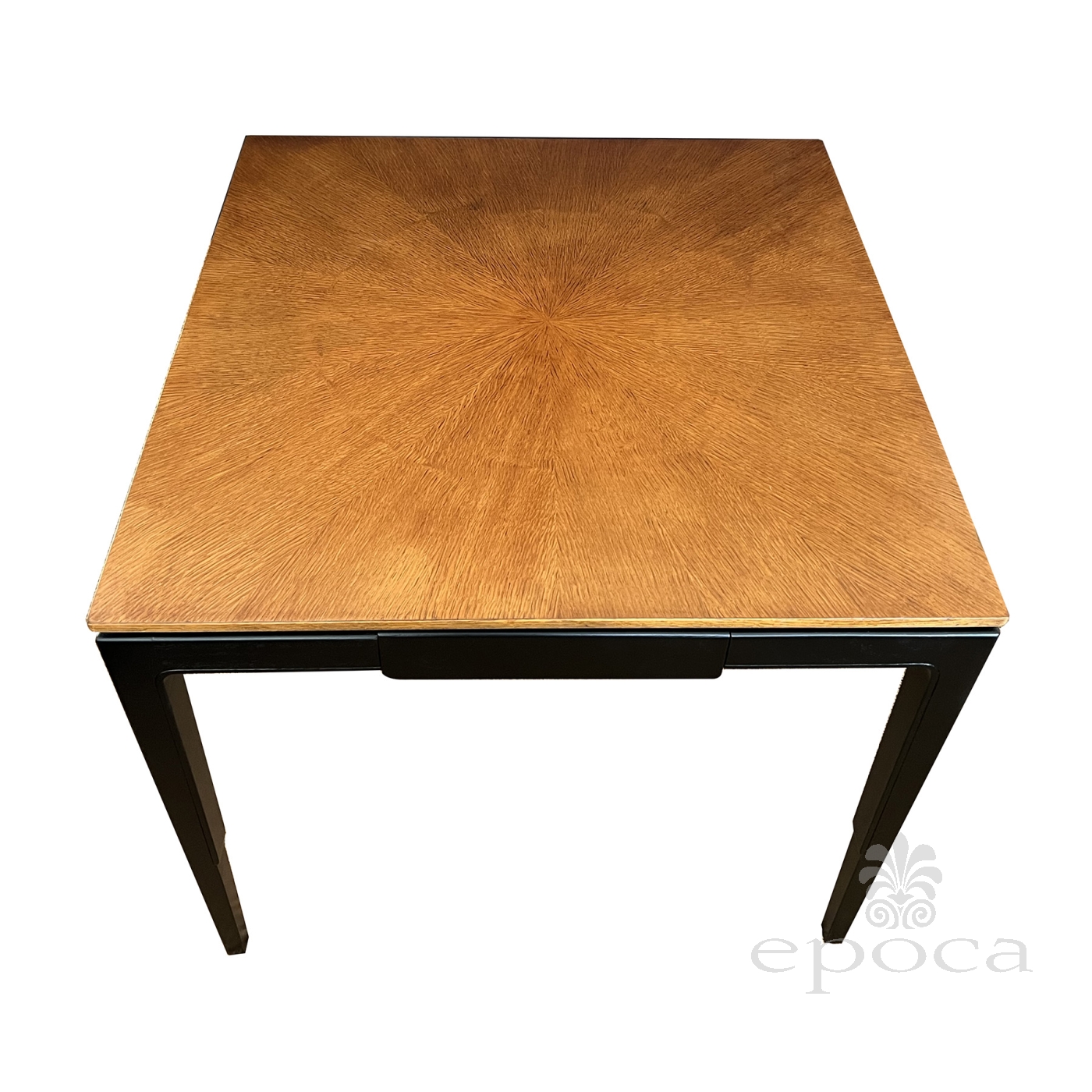 the square game table with 'floating' top of radiating oak veneer; above an ebonized body fitted with two drawers with oak secondary wood; raised on tapering, stepped quadrangular supports; each barrel-back chair with incurved back and downward sloping arms flanking a tight seat; all raised on tapering legs; professionally refreshed surface; good vintage condition with sturdy frames; reupholstered