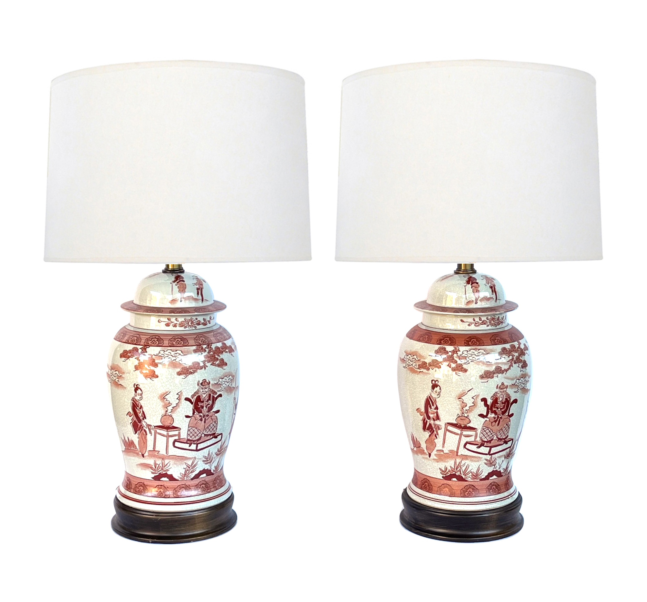 each hand painted ginger jar with domed lid above a bulbous tapering body raised on a stained wooden base; painted with various figures in a landscape setting divided by cloud scroll perimeter bands; craquelure to glaze; good antique condition; now mounted as lamps; rewired