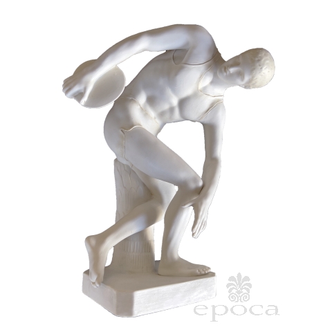 the well-defined athlete with contorted body about to begin his throw; with beautifully delineated face, hands and feet wearing sheer, form-fitting shirt and shorts; excellent condition with only minor wear; some discoloration