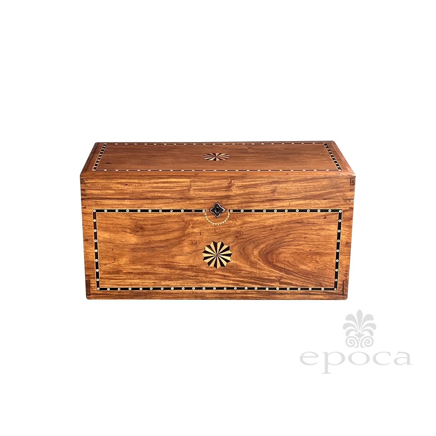 the hinged rectangular lid resting on a conforming body flanked by wrought iron handles; adorned on all sides with an exotic wood inlaid perimeter band inset with bone inlay; the front, top and back centering a pinwheel motif; good antique condition with professionally refinished surface; warm honey-color patina with overall wear; lock mechanism now lacking