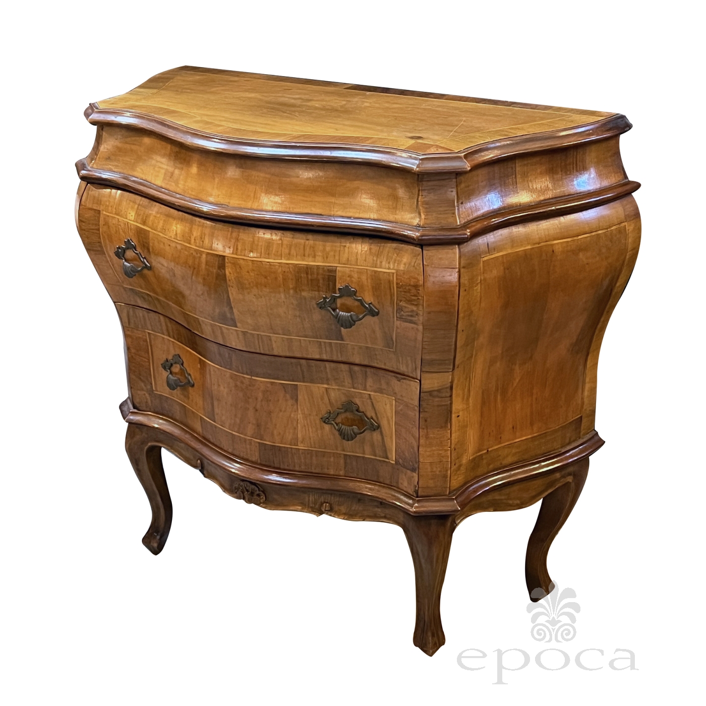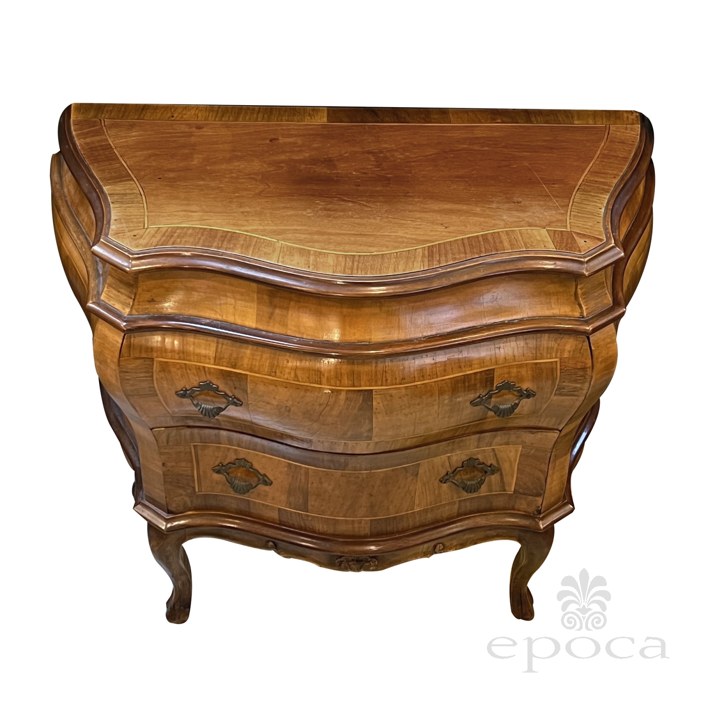 Pair Italian Rococo Style Bombe-form Two-Drawer Olivewood Chests/Nightstands
