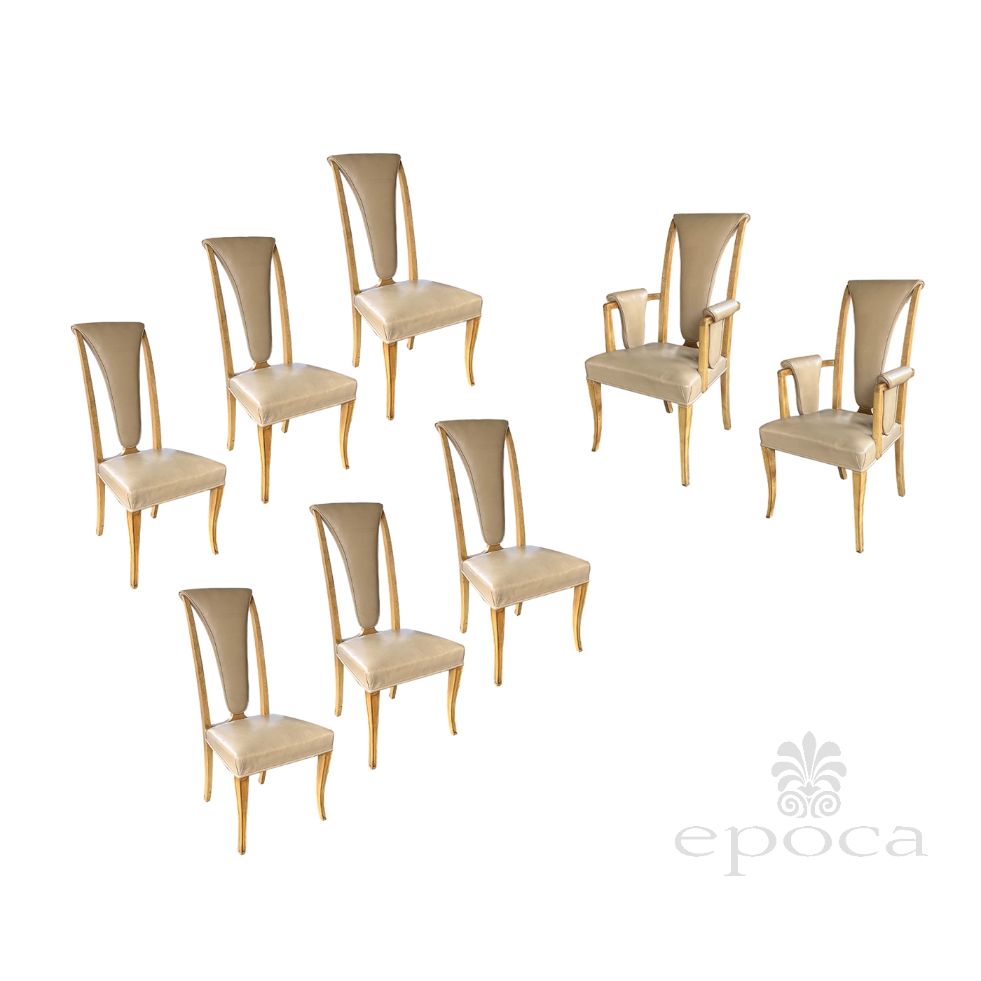 of good scale and quality, circa 1930; each high back dining chair with beige leather upholstery and birdseye maple frame, for S.Hille & Co, London, consisting of two arm and six side chairs, having a vasiform splat above a tight seat; raised on graceful splayed supports; professionally refinished; minor wear and patina to later leather upholstery;