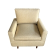 an early 1950s production Florence Knoll for Knoll International lounge chair with loose back and seat cushions all resting on four turned tapering legs; professionally refinished with new butter-yellow linen upholstery; excellent vintage condition with sturdy hardwood frame