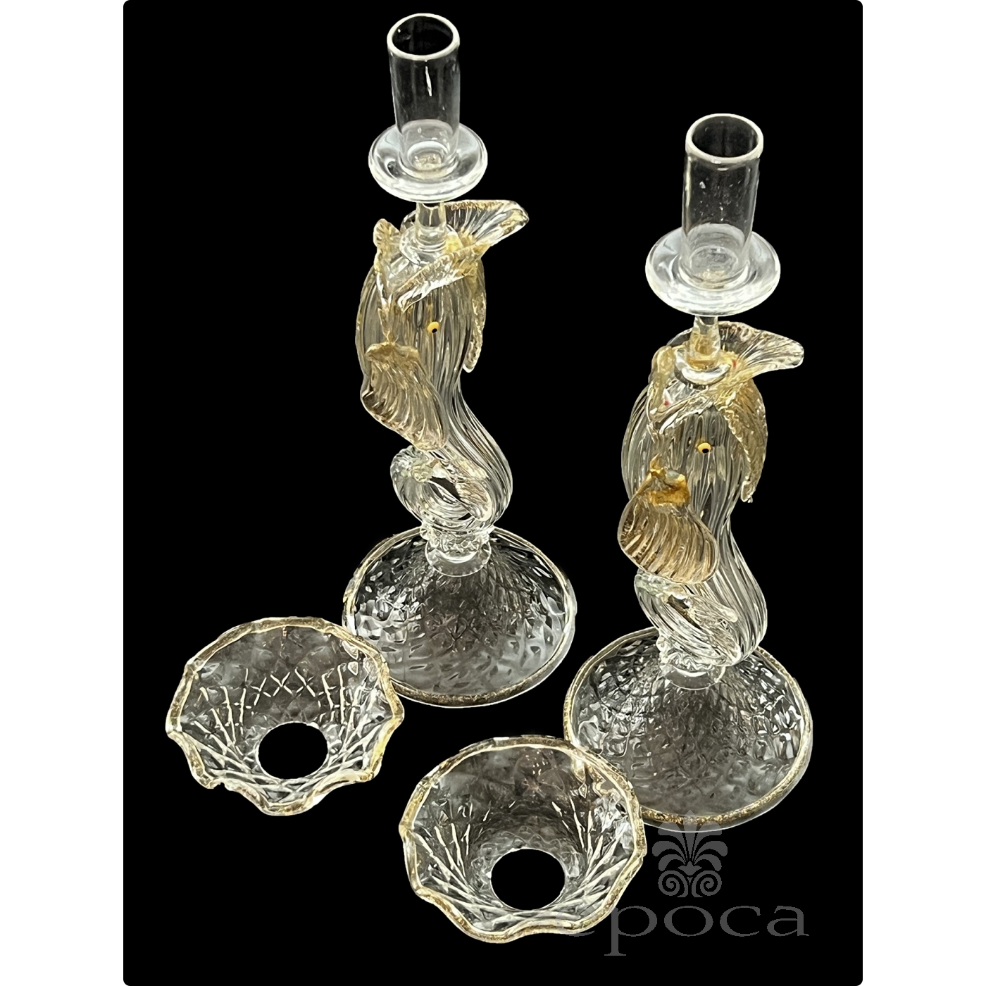 An unusual pair of hand-blown clear and gold aventurine Venetian candlesticks with large-scale dolphin connectors made by Salviati, circa 1920's featuring dramatic full-bodied upward-facing dolphins; raised on a splayed quilted foot with removable quilted bobeche; excellent condition with no chips or cracks;