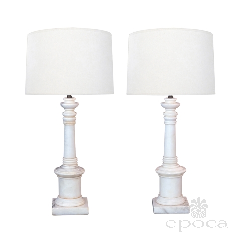 Pair 1950s White Marble Columnar Lamps in the Neoclassical Taste
