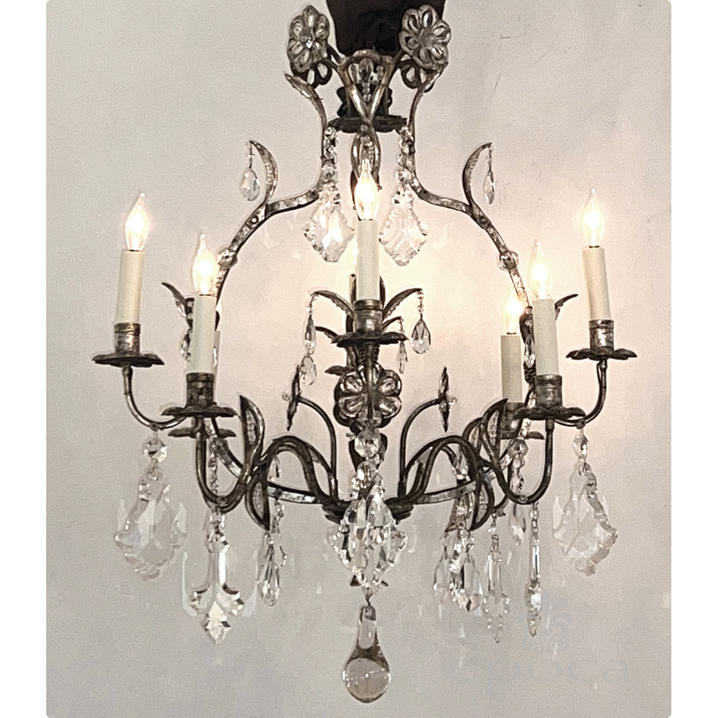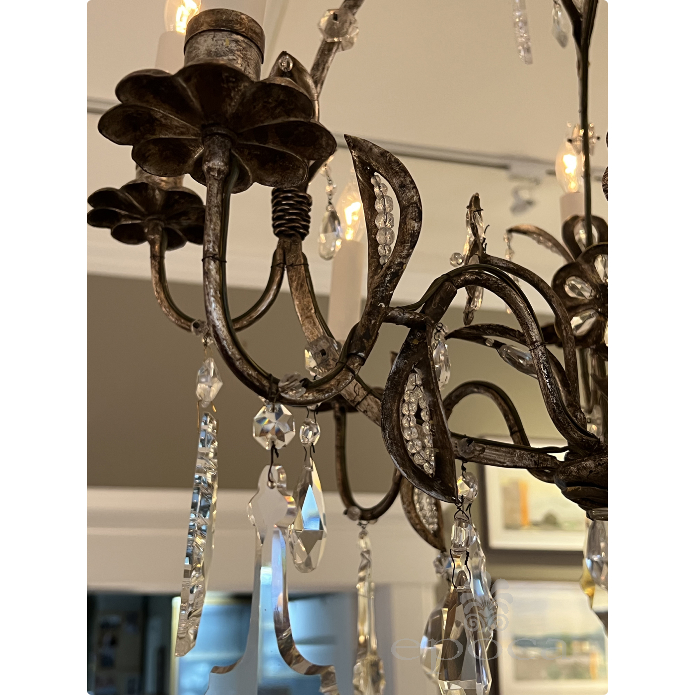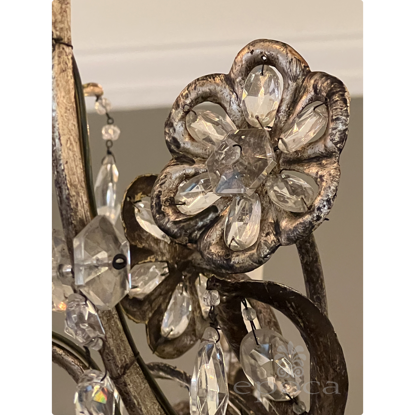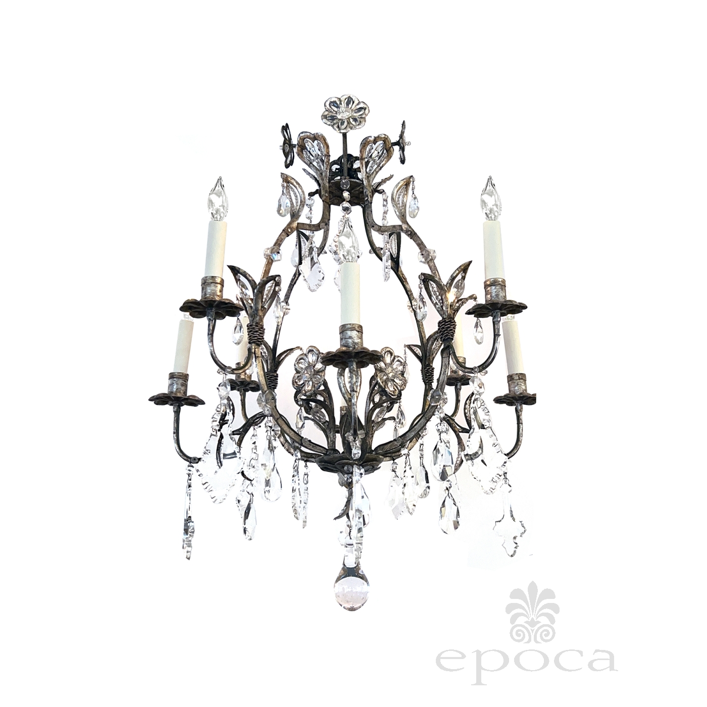 composed of a gilt-metal basket-form frame emanating 8 candlearms; adorned overall with crystal flower heads, beaded leaves and crystal pendants; good vintage condition with overall even wear to gilded surface; professionally rewired
