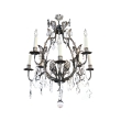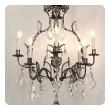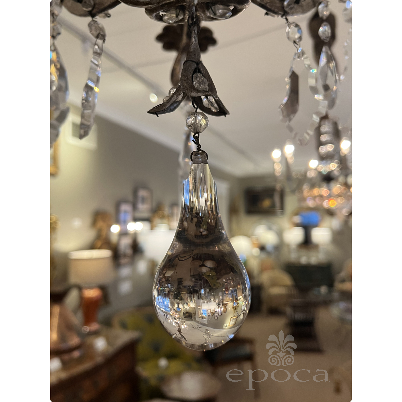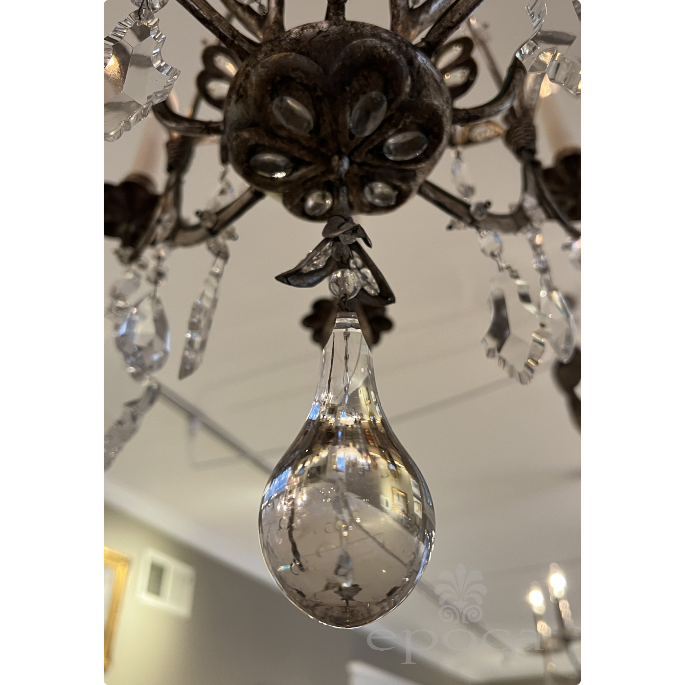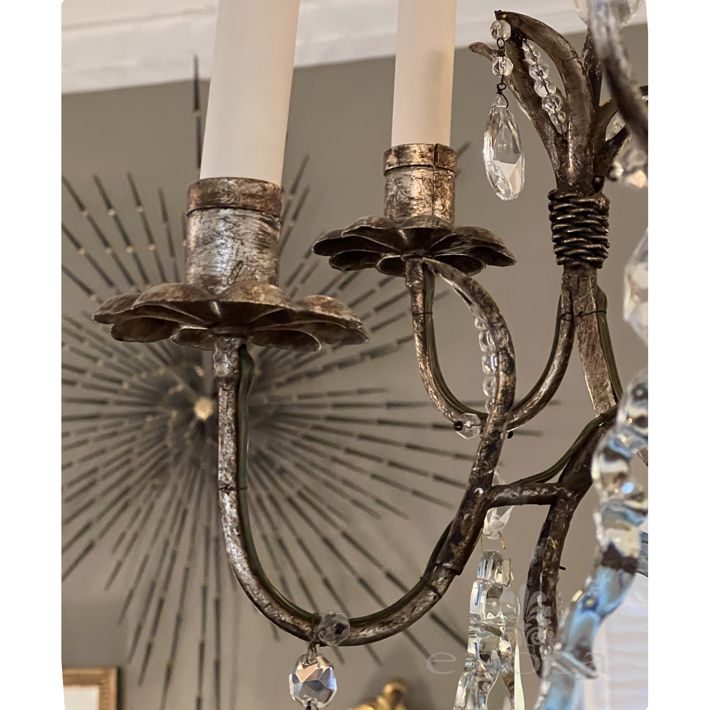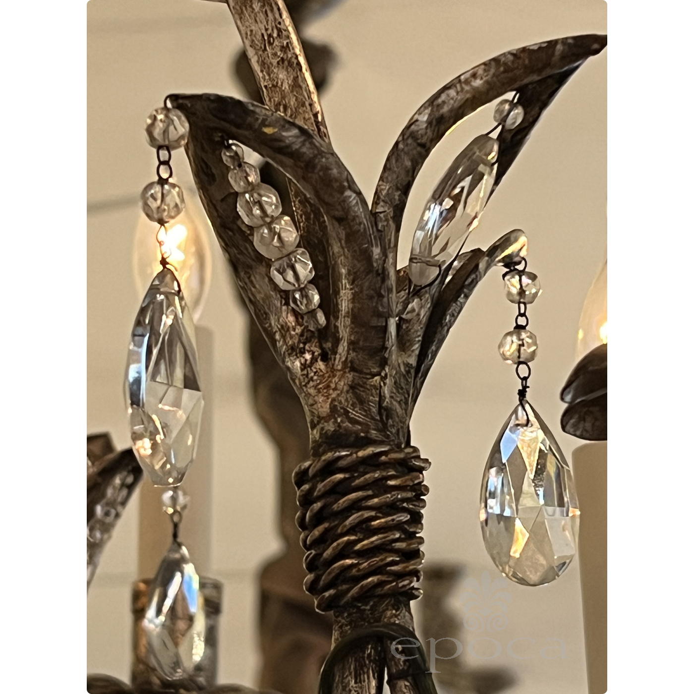 composed of a gilt-metal basket-form frame emanating 8 candlearms; adorned overall with crystal flower heads, beaded leaves and crystal pendants; good vintage condition with overall even wear to gilded surface; professionally rewired