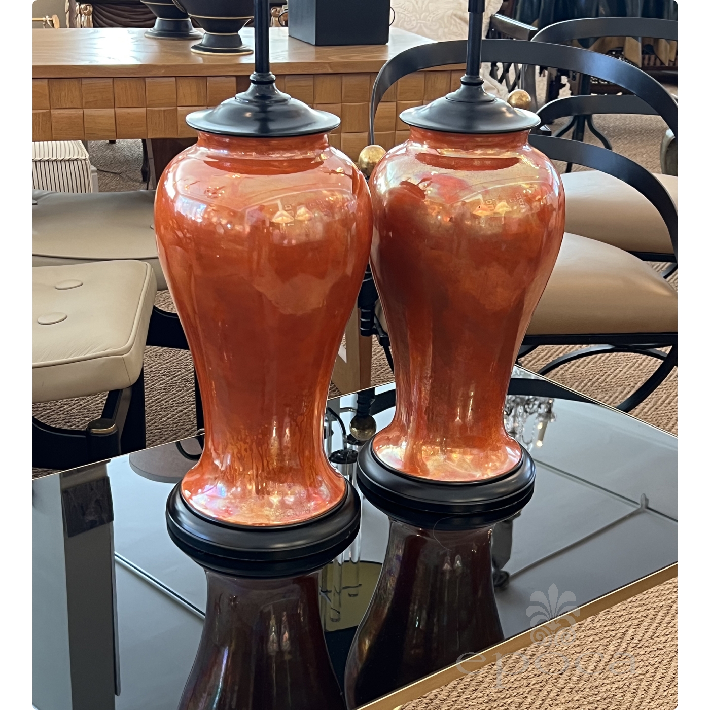each with short everted neck above a baluster-form body all ending in a splayed foot; with ebonized metal cap and wooden bases; all in a rich orange lustre glaze; undersides impressed RUSKIN / ENGLAND 1919; Ruskin Pottery was an English art pottery studio founded in 1898, and closing in 1935. They were known for their innovative glazes especially for their lustre glaze which resembled metallic finishes; height: 15" (top of pottery) 28" (top of shade); remnants of an old label; overall good antique condition with rubbing and losses to lustre glaze with white underglaze showing; glazing and firing flaws; re-painted caps and bases