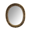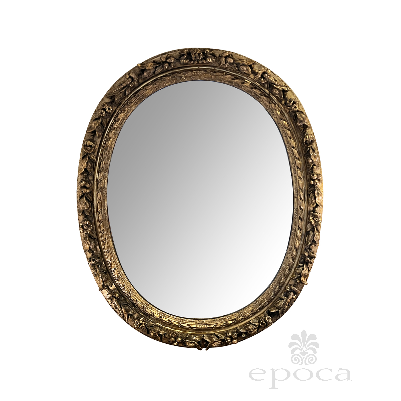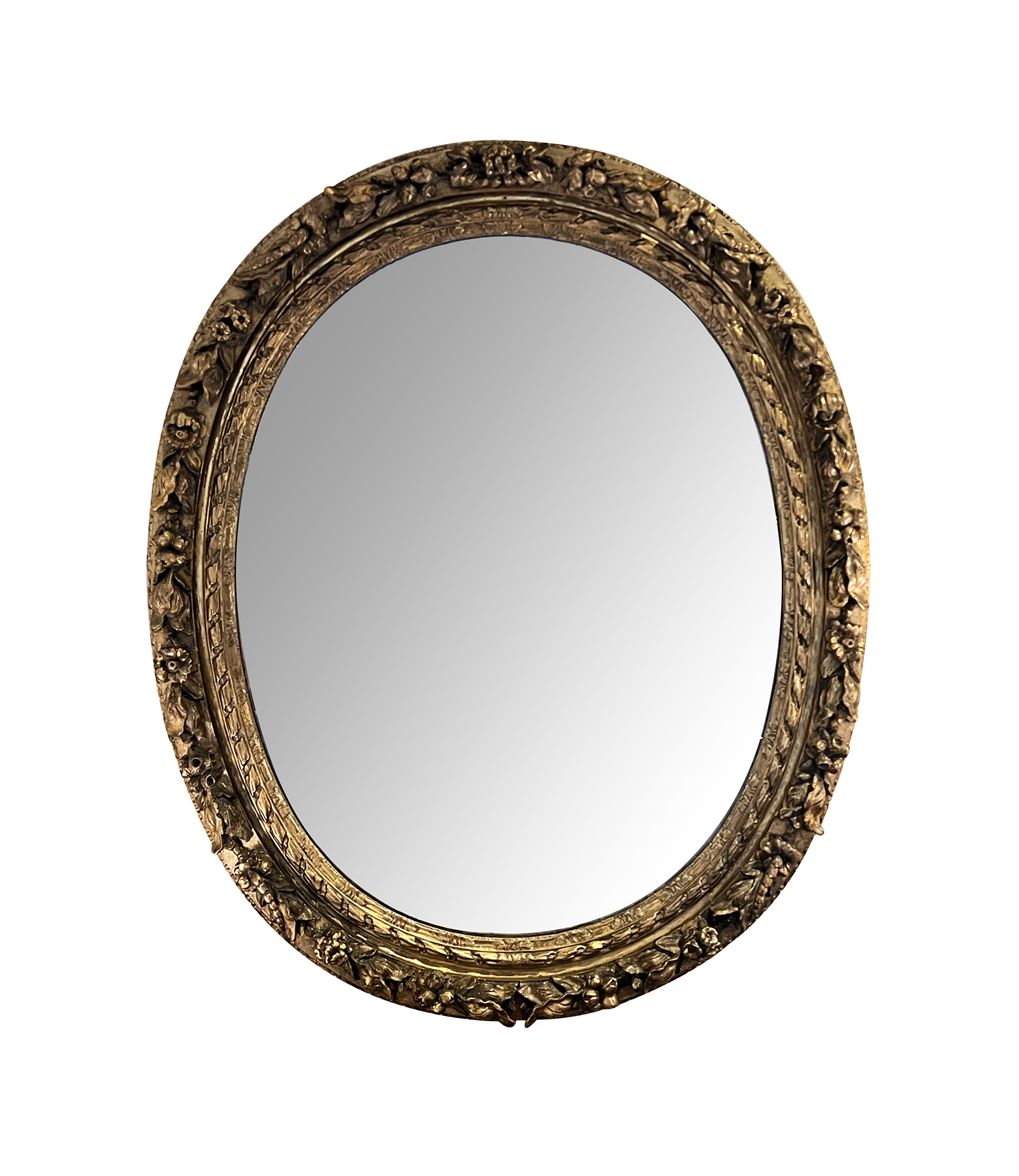 the finely carved frame encircled by a floral and foliate garland in high relief all surrounding the original mercury plate; overall even wear and patina; age and antiquing to mirror plate