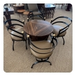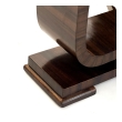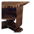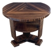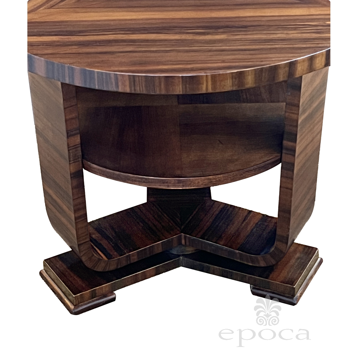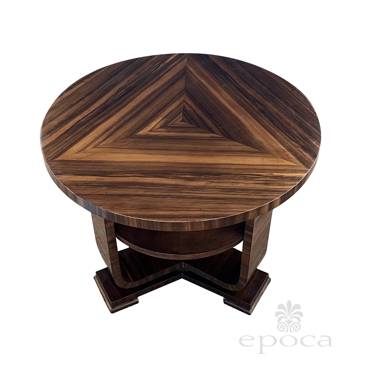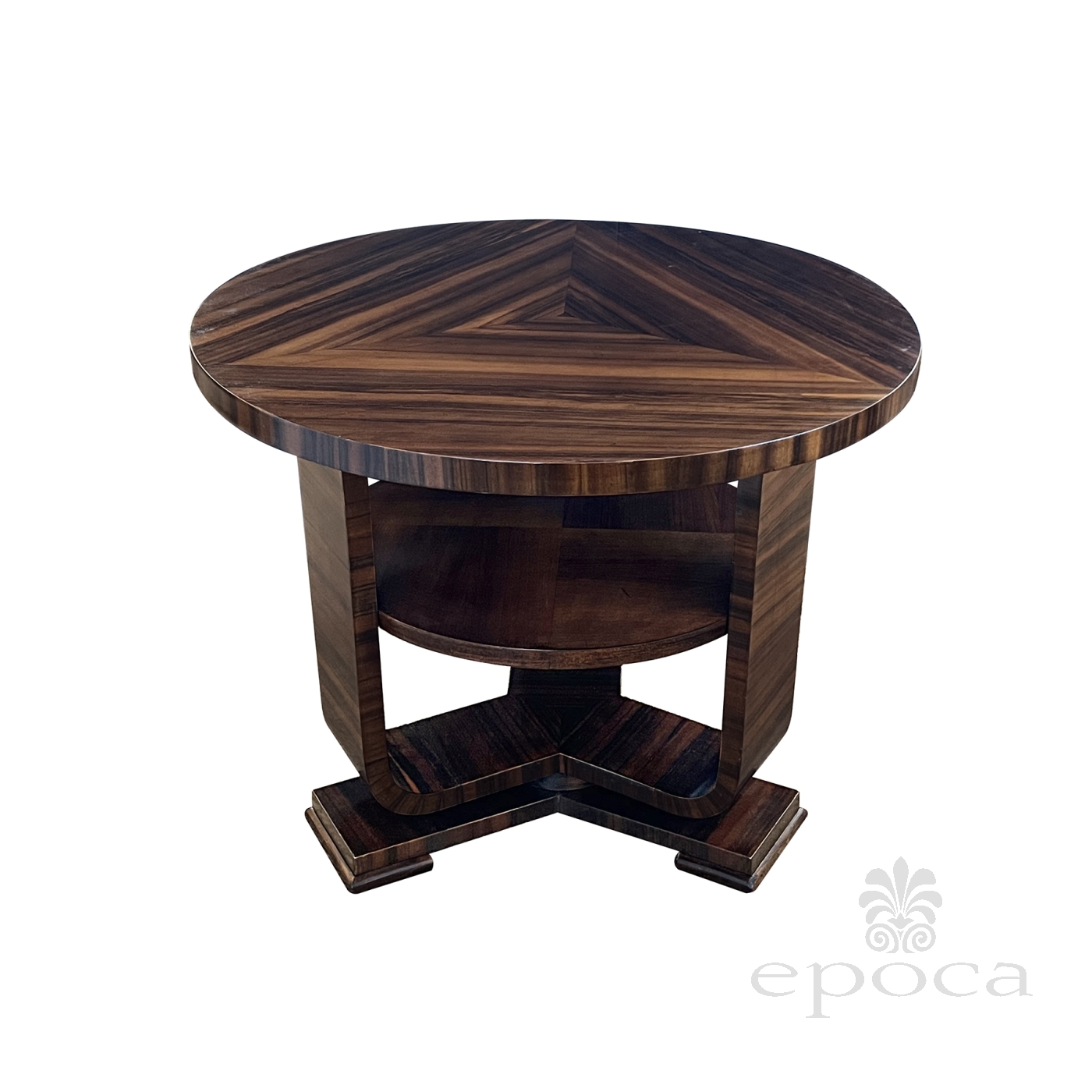 of iconic Art Deco design; the round top of deeply patinated and well-figured quarter-veneered macassar ebony raised on incurved supports joined by a lower shelf; all over a tripod base with block feet; good antique condition and structurally sound; some old splits to veneer; professionally refinished with small areas of replaced veneer