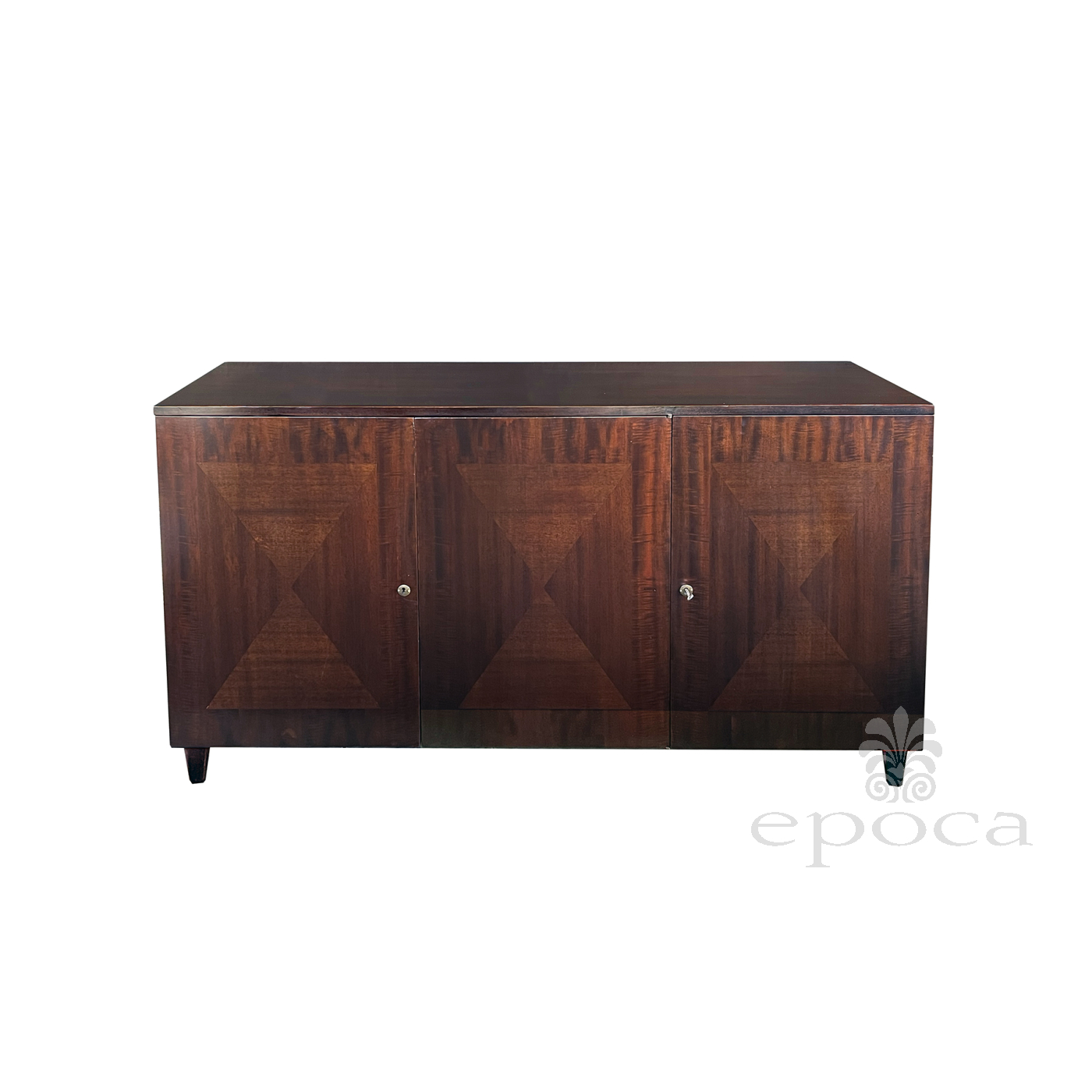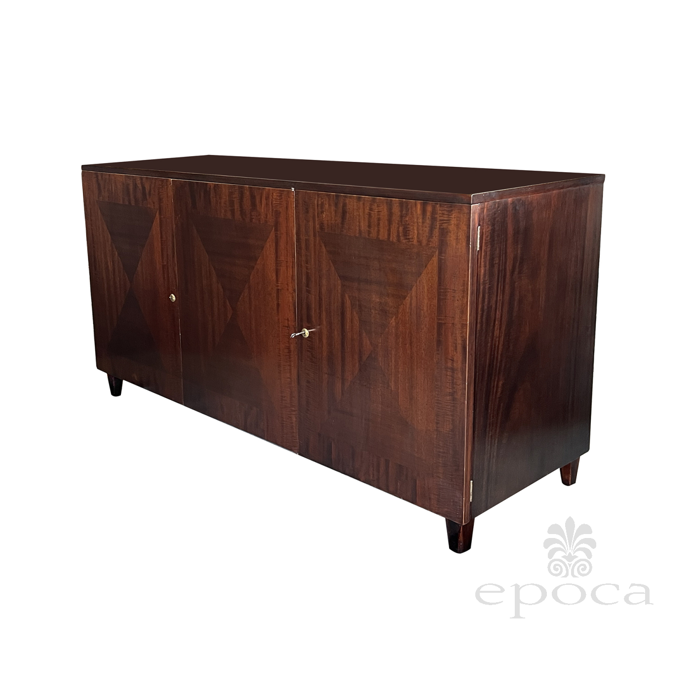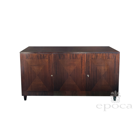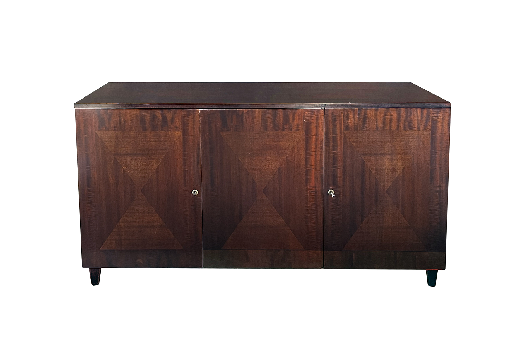 the handsome credenza by John Stuart with its simple, straightforward design constructed of richly-patinated and well-figured tiger mahogany; the rectangular top above a conforming body fitted with three doors faced with beautiful bookmatch veneer opening to reveal four oak-lined drawers with mahogany fronts; all raised on tapering quadrangular supports; good vintage condition with small areas of replaced veneer; professionally refinished; upper right interior drawer replaced.