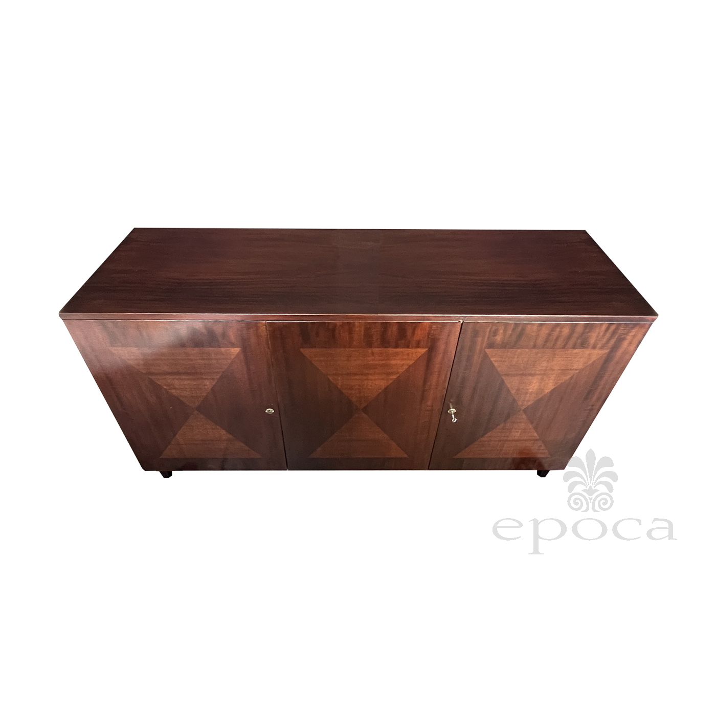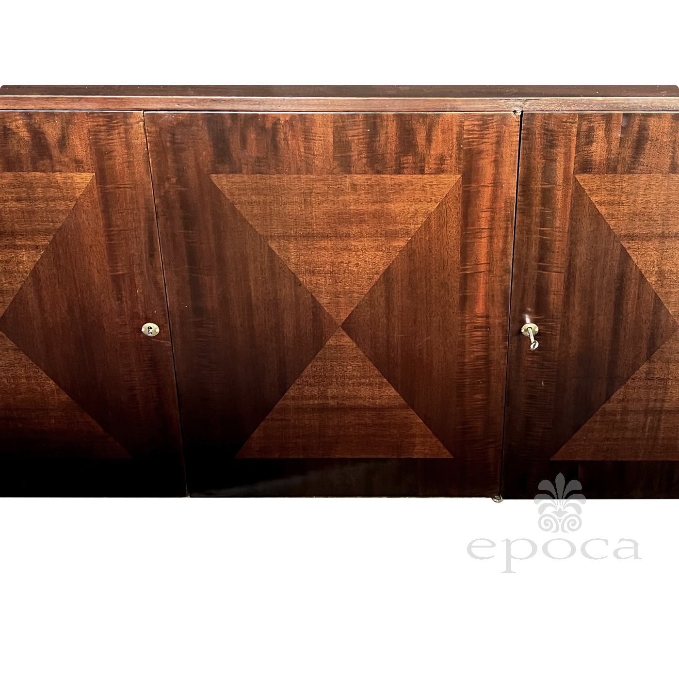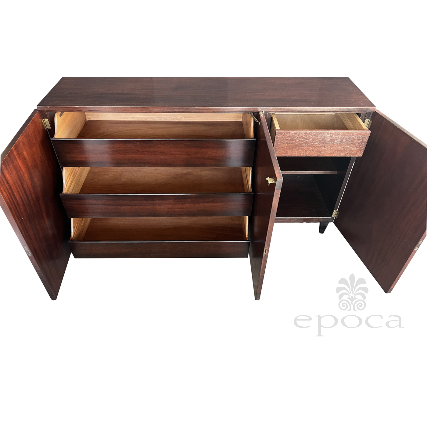 the handsome credenza by John Stuart with its simple, straightforward design constructed of richly-patinated and well-figured tiger mahogany; the rectangular top above a conforming body fitted with three doors faced with beautiful bookmatch veneer opening to reveal four oak-lined drawers with mahogany fronts; all raised on tapering quadrangular supports; good vintage condition with small areas of replaced veneer; professionally refinished; upper right interior drawer replaced.