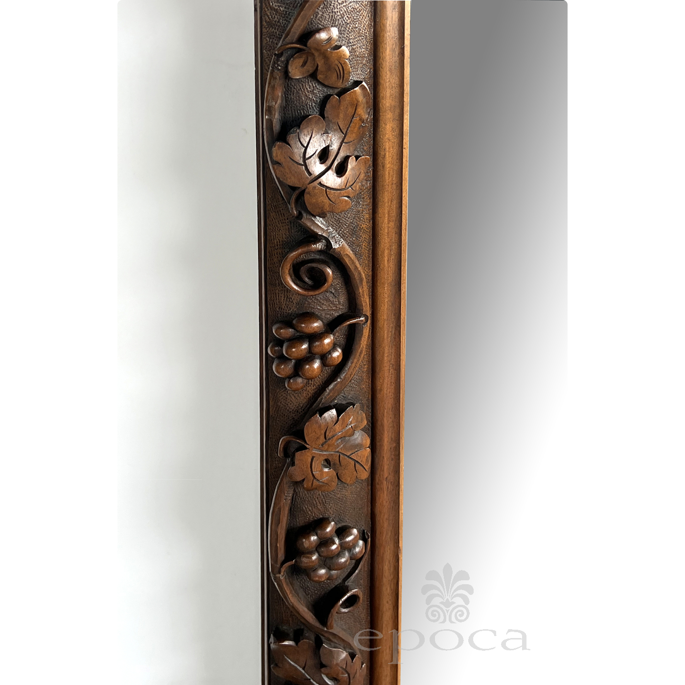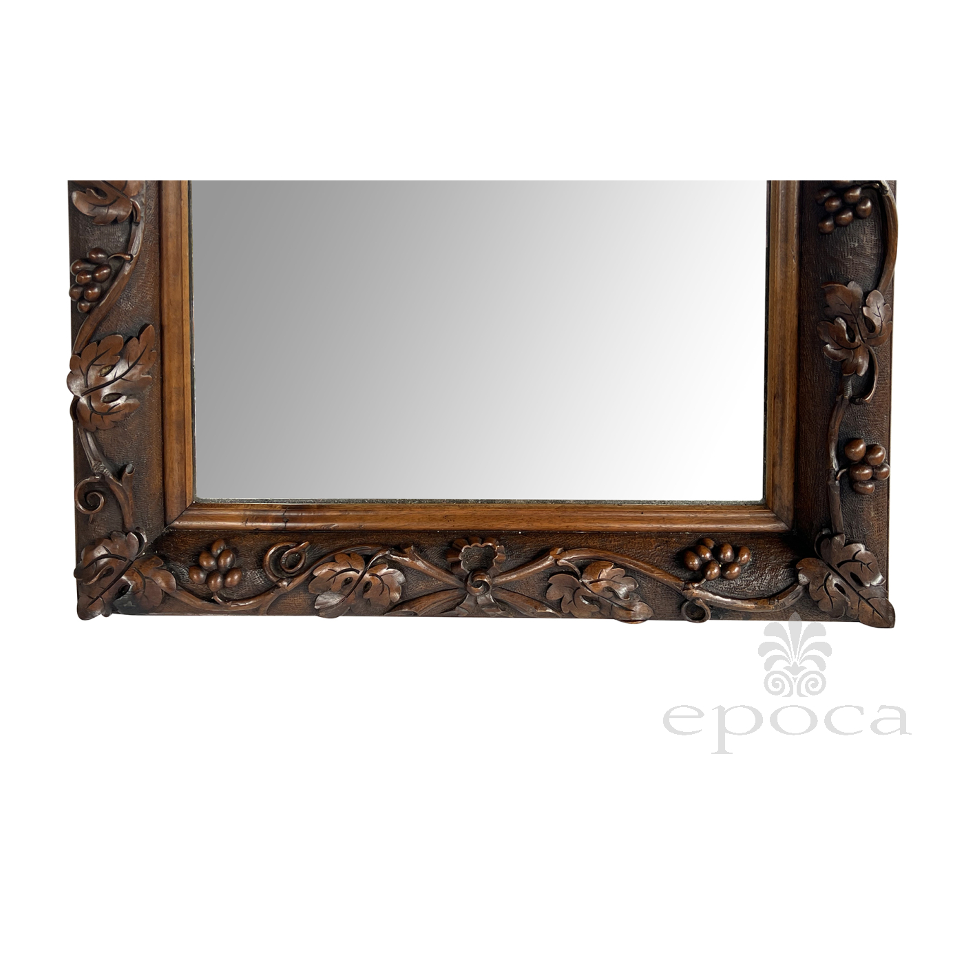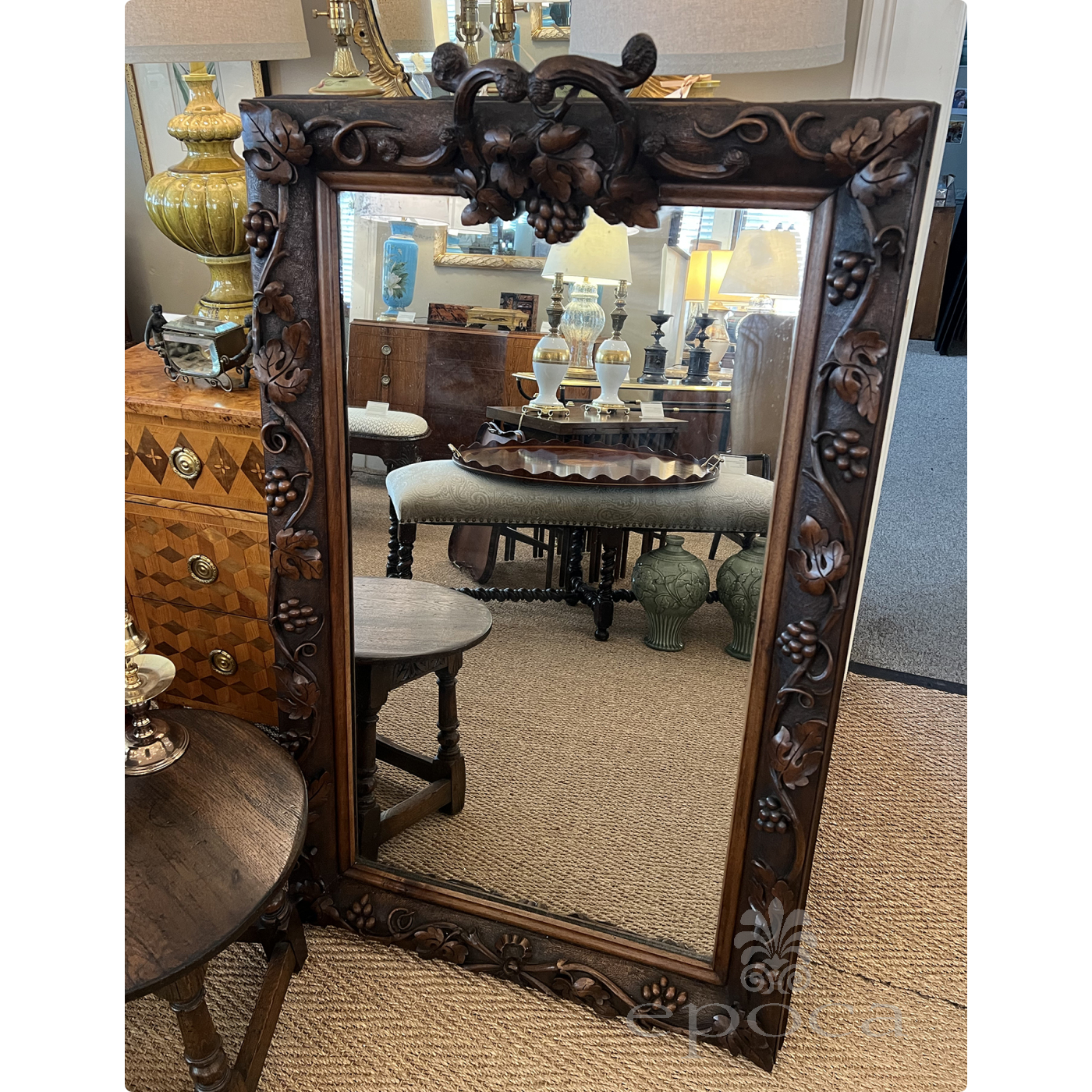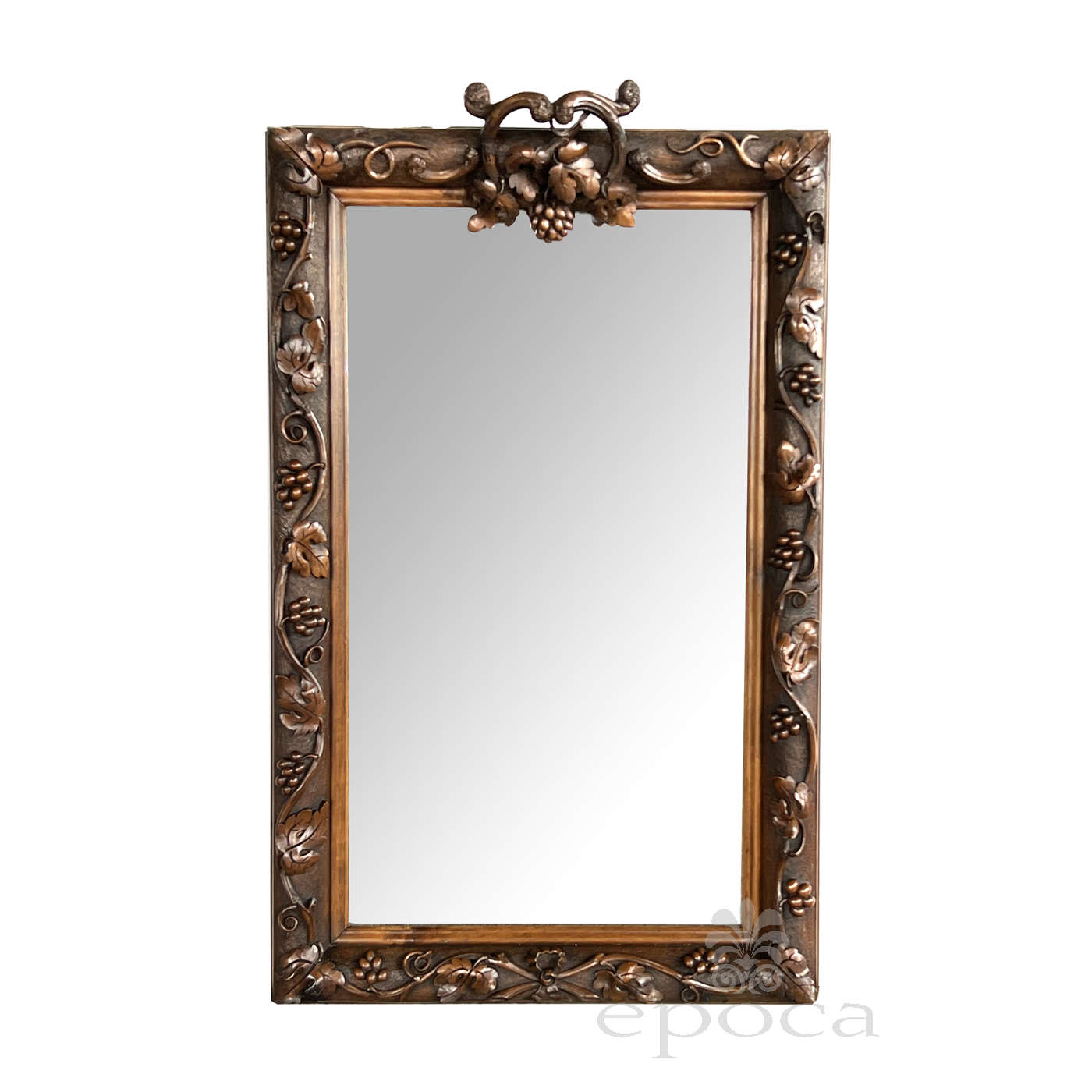 the original rectangular mercury plate within a conforming surround surmounted by a bold crest emanating a deeply carved meandering grape vine with robust leaves and grape clusters; professionally refinished with deep patina; some loss of silvering to plate; chipping to outer edges