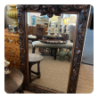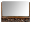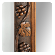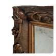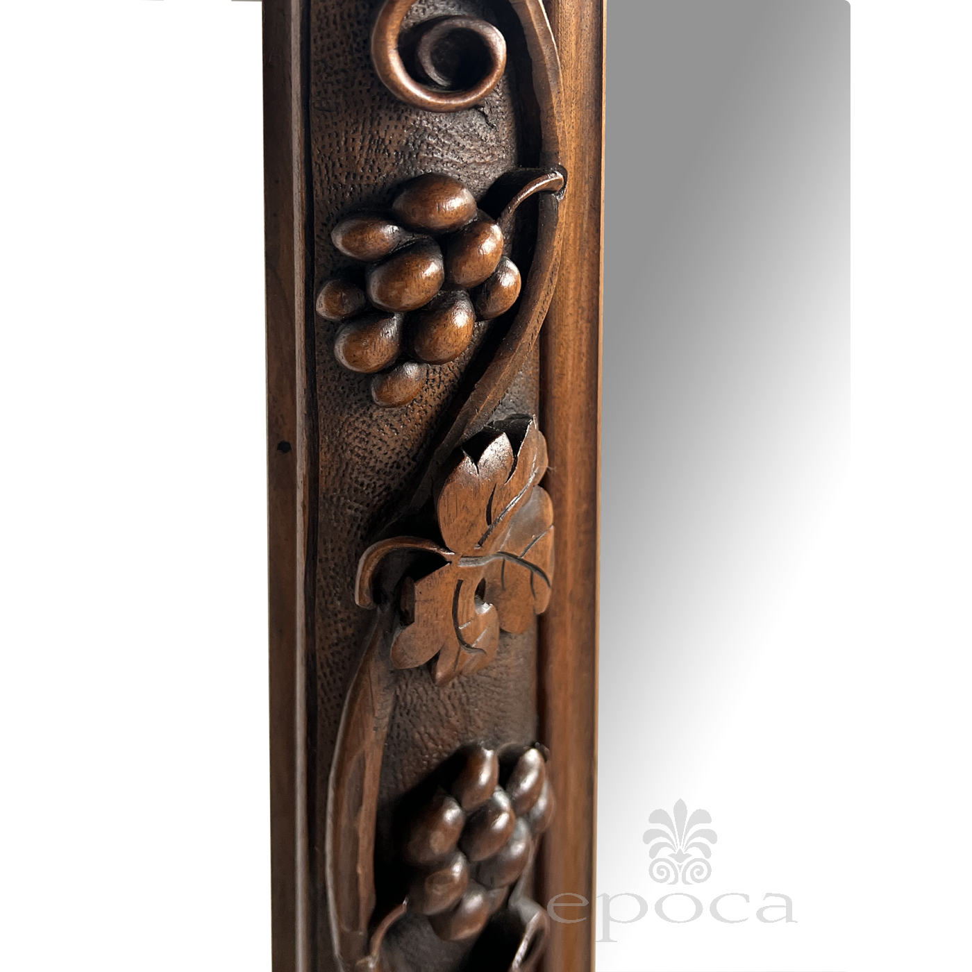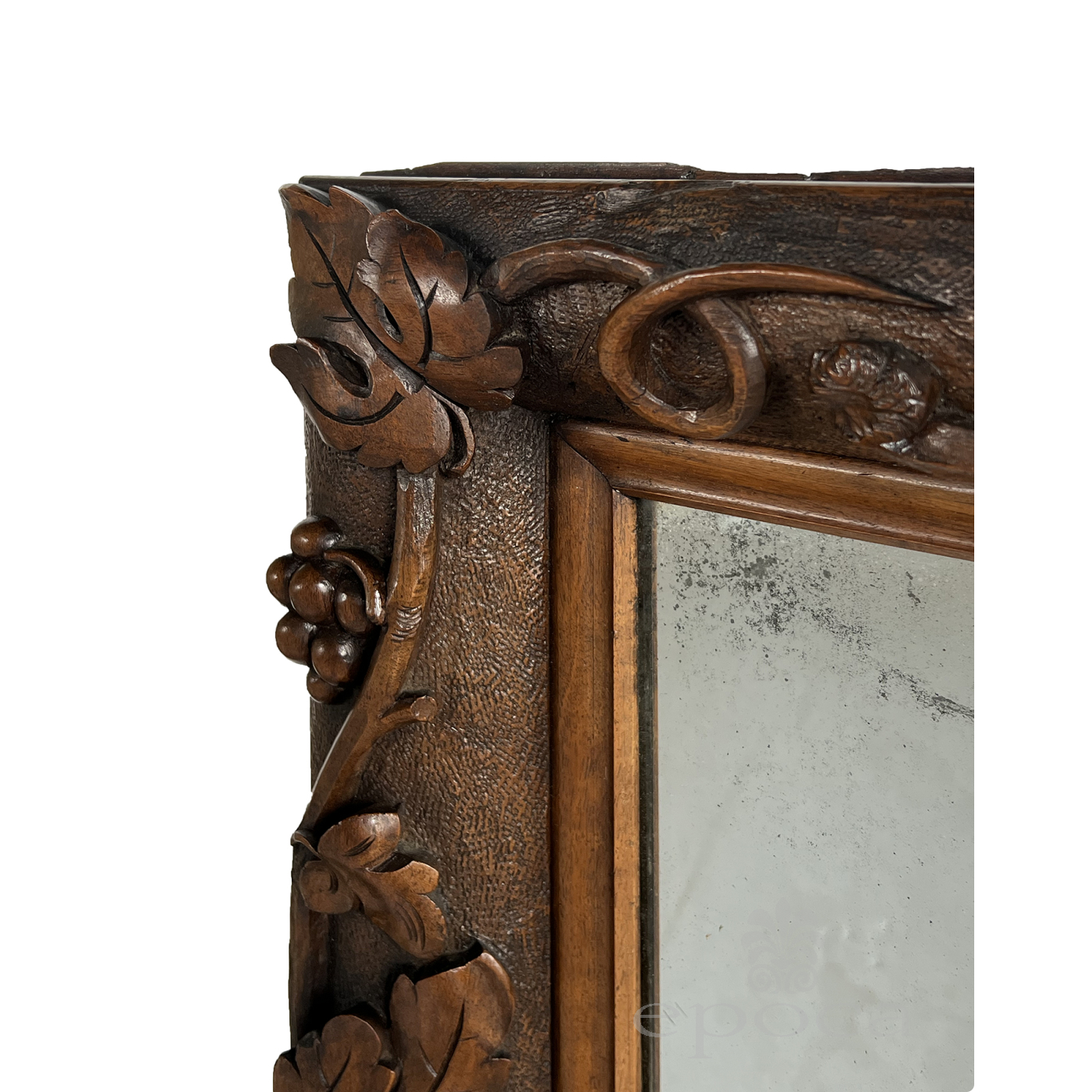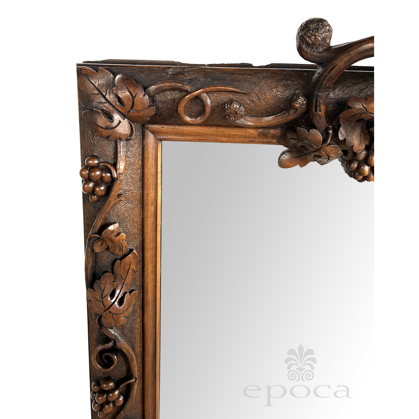the original rectangular mercury plate within a conforming surround surmounted by a bold crest emanating a deeply carved meandering grape vine with robust leaves and grape clusters; professionally refinished with deep patina; some loss of silvering to plate; chipping to outer edges