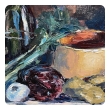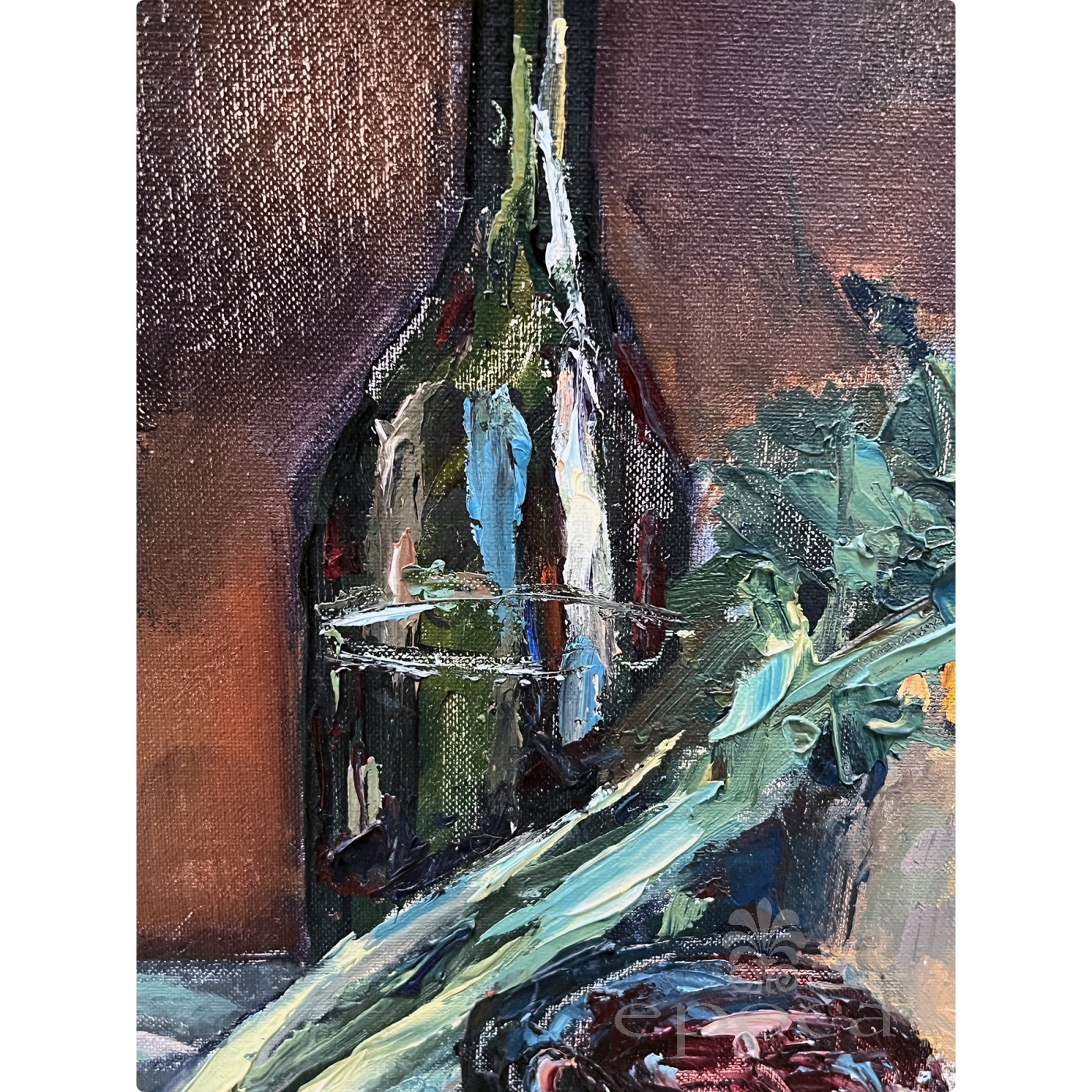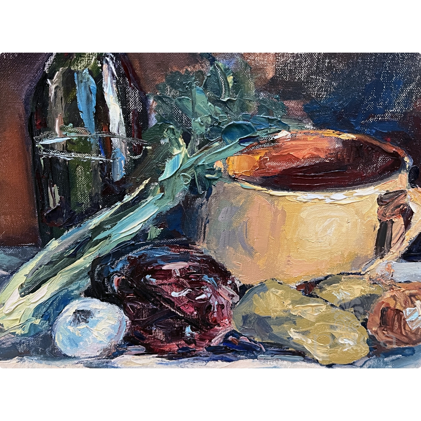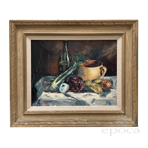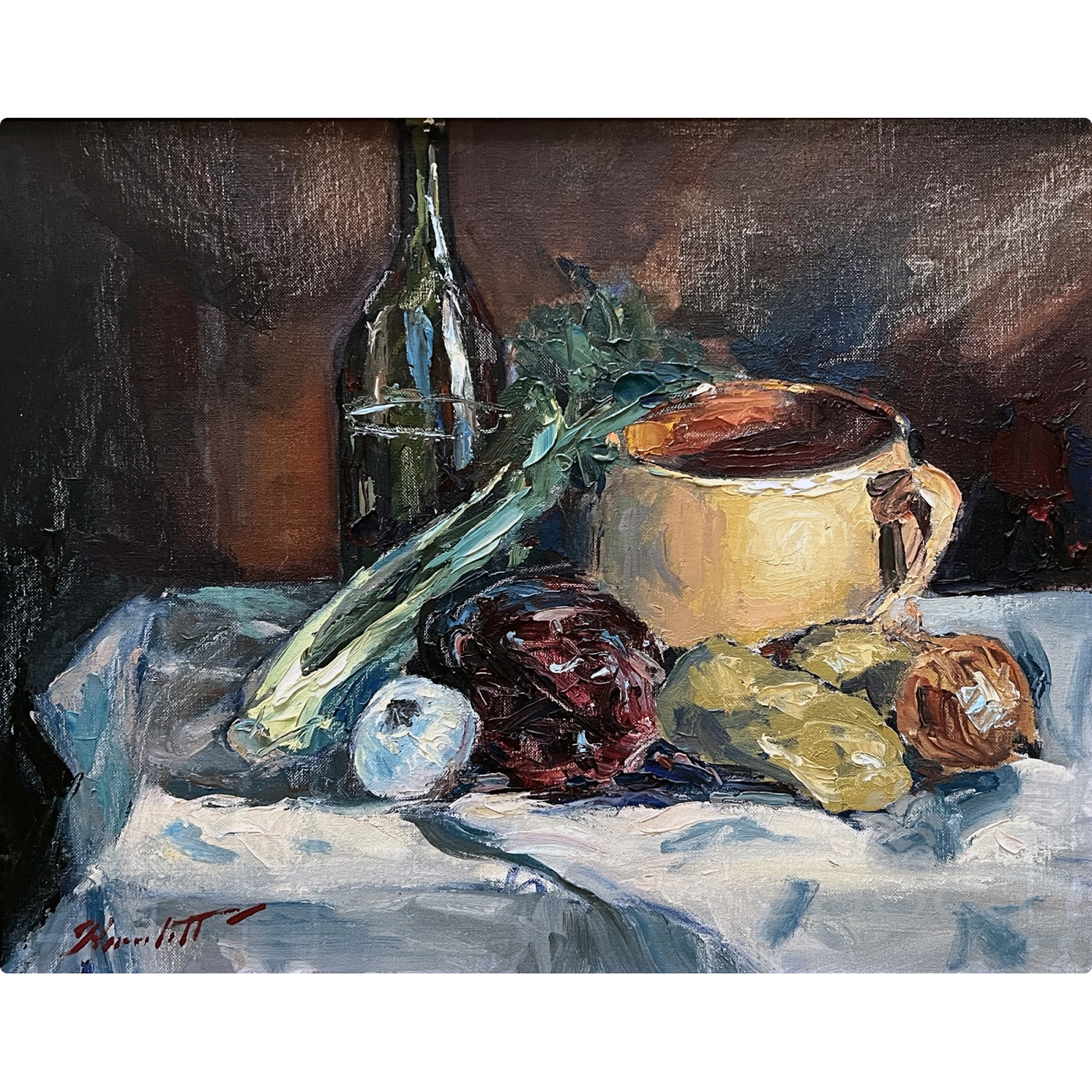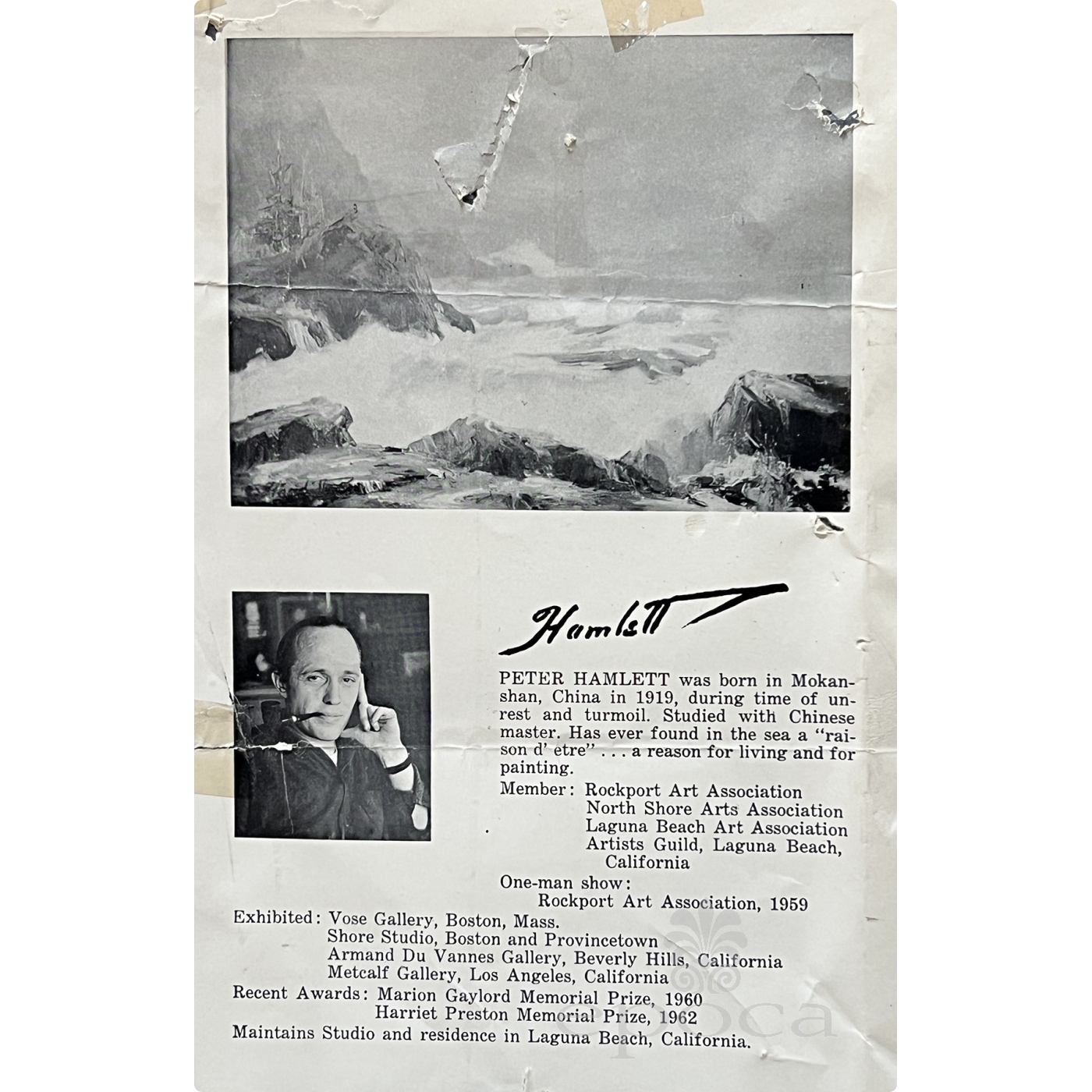 Peter Hamlett (American 1919-1972) signed Oil on Board, dated 1966 verso; the lush impressionist style still life painting with thick broad brushstrokes depicting a tablescape setting with a copper pot, various vegetables and a bottle of wine; signed lower left and verso and titled 'Staff of Life' Laguna Beach 1966; Born in 1919 in Mokanshan, China during a time of political unrest, Peter Hamlett, a seascape painter, left China at age 18 when he graduated from Shanghai American School. He was enrolled in Wake Forest University in North Carolina and had plans to follow in his father's footsteps as a minister. He fell in love with the ocean on that long voyage and loving the ocean, he then spent much time searching for exciting shores to paint. His quest took him to Hilo, Hawaii where he was a photographer; to Catalina Island where he lived on a sailboat; to Rockport, Massachusetts; Alaska; Depoe Bay, Oregon; and later to Laguna Beach, California where he had a studio for many years; good vintage condition with nice clean surface and bright colors; original wooden frame; linen liner replaced