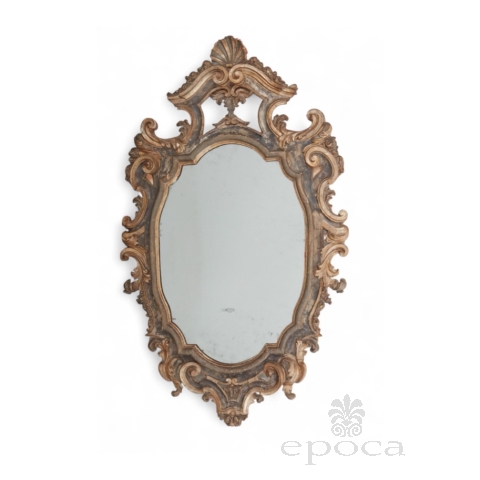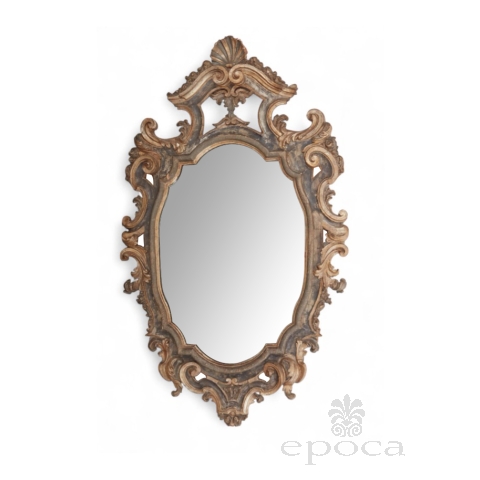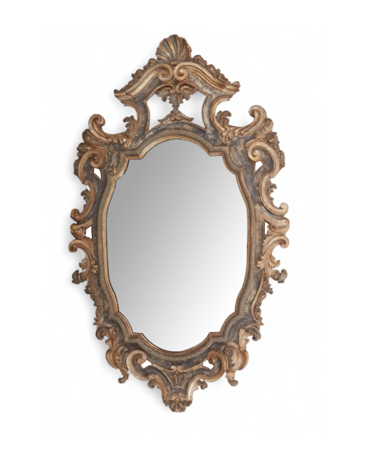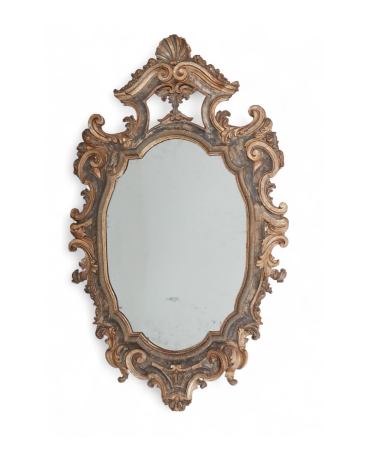 the large round mirror within a well-carved pale blue and silver-gilt frame capped with a shell motif over an openwork crest; all above an exuberantly carved frame with lively C-scrolls and acanthus leaves; purchased in 2022 from the estate of antique dealer Bartolomeo Rizzo, Palermo, Italy; good antique condition with some replacements, elements re-glued; professionally restored with refreshed surface; nice overall even wear and rubbing to surface; later plate