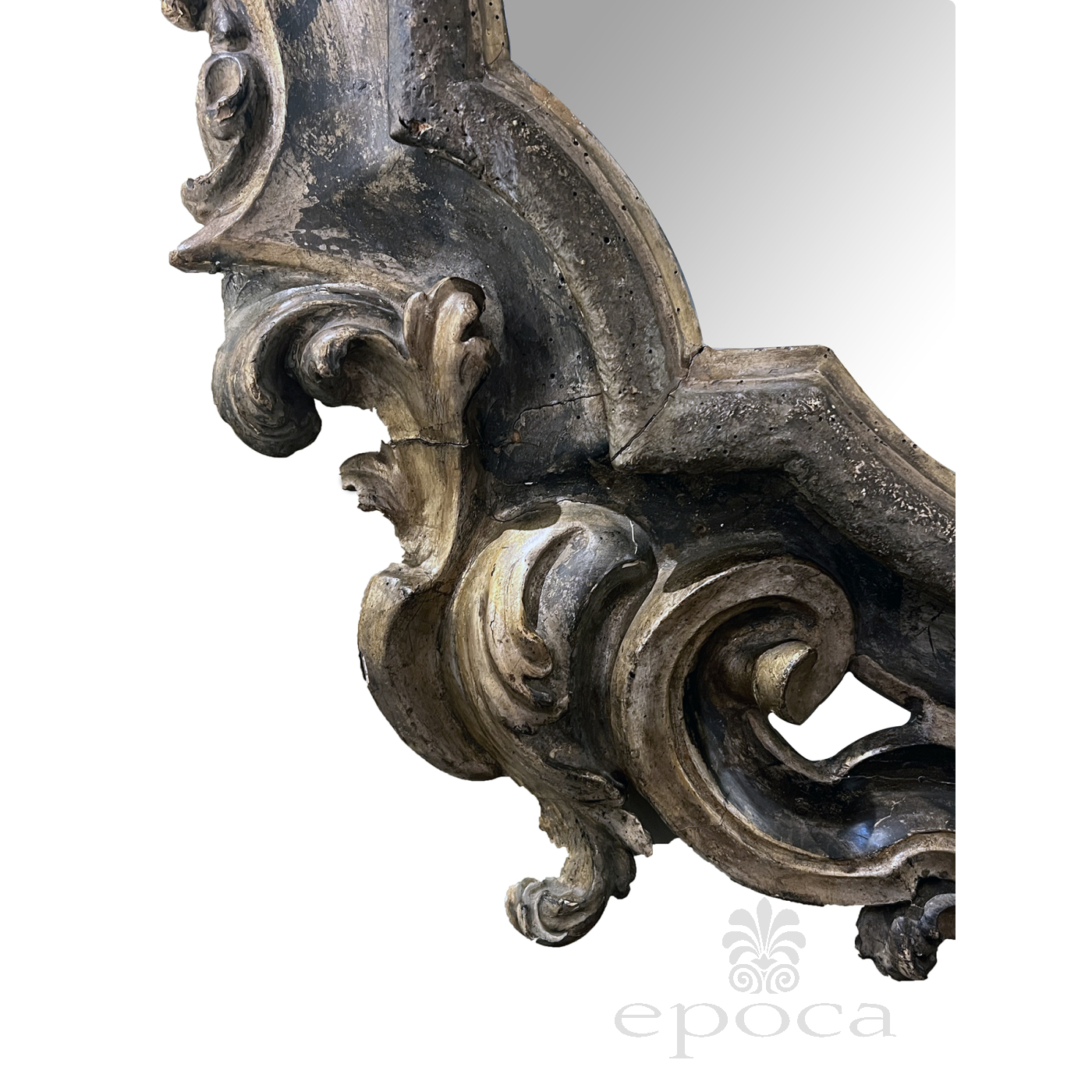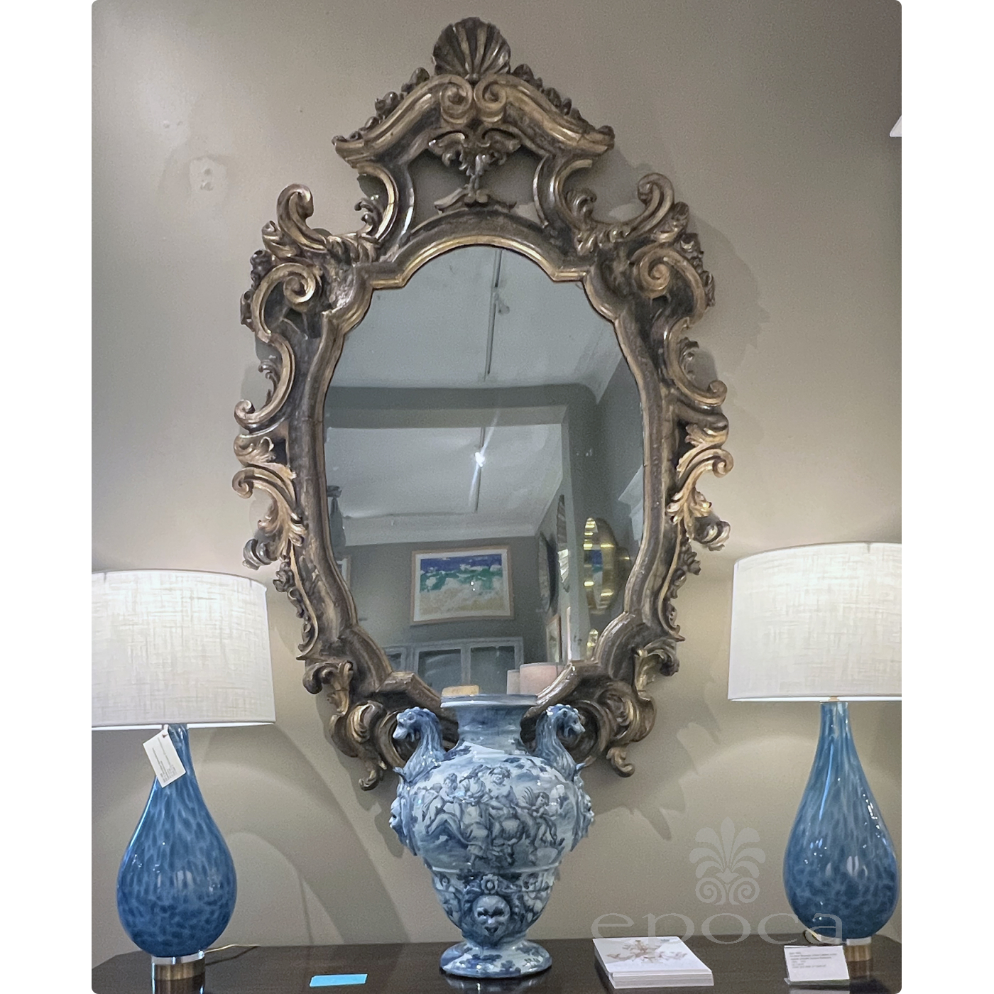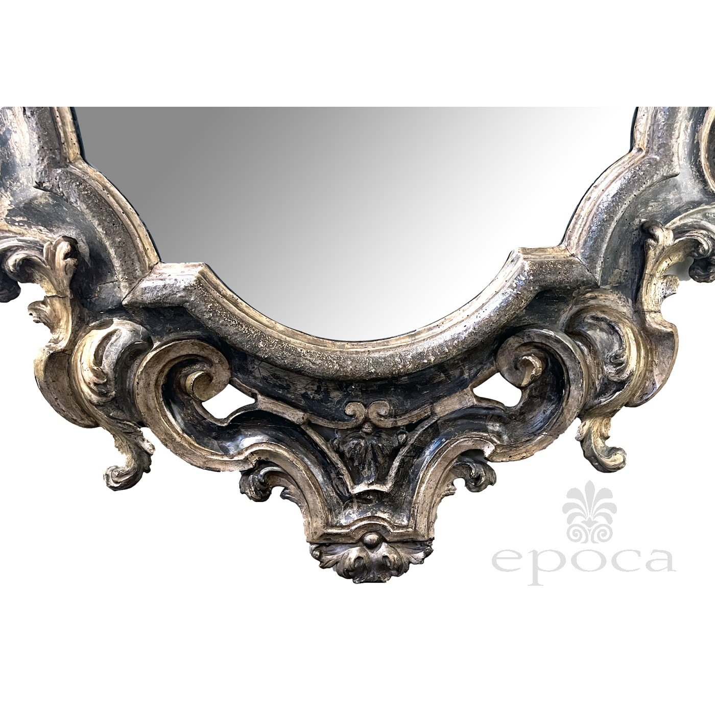 the large oval-form mirror within a well-carved pale blue and silver-gilt frame capped with a shell motif over an openwork crest; all above an exuberantly carved frame with lively C-scrolls and acanthus leaves; ex-collection Bartolomeo Rizzo, Palermo, Italy; good antique condition with some replacements, elements re-glued; professionally restored with refreshed surface; nice overall even wear and rubbing to surface; later plate