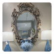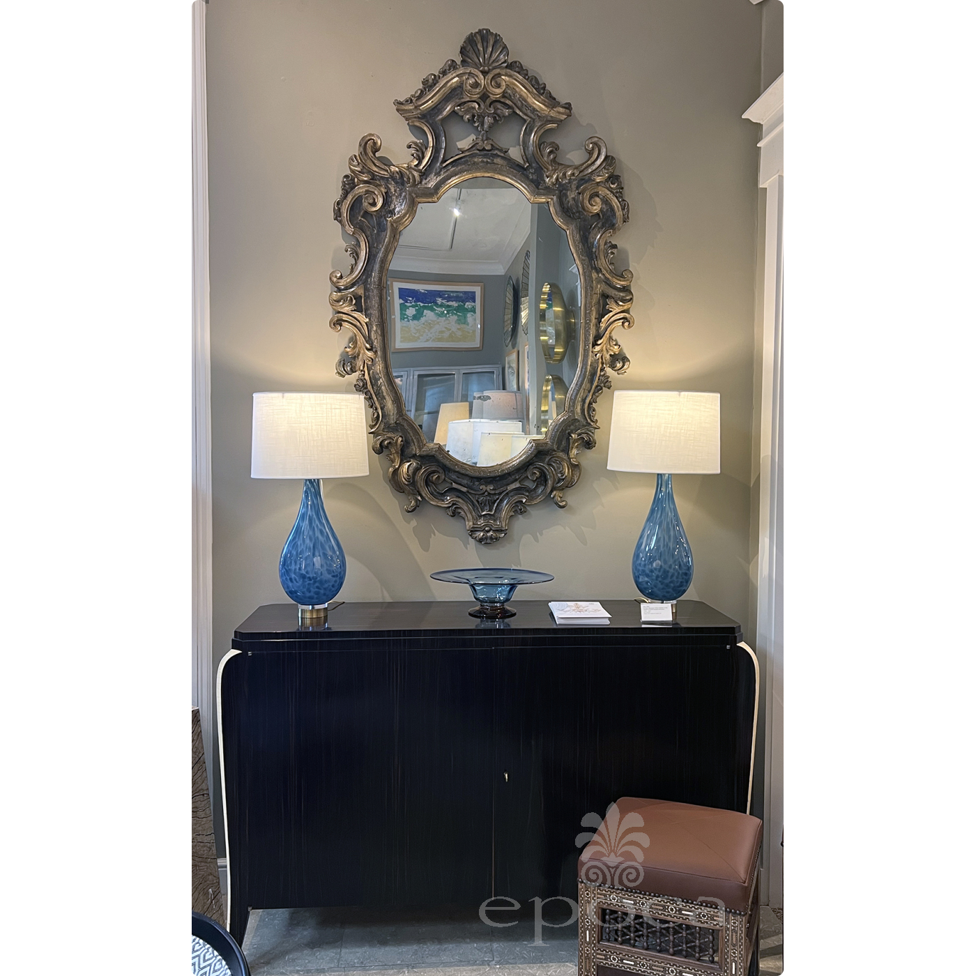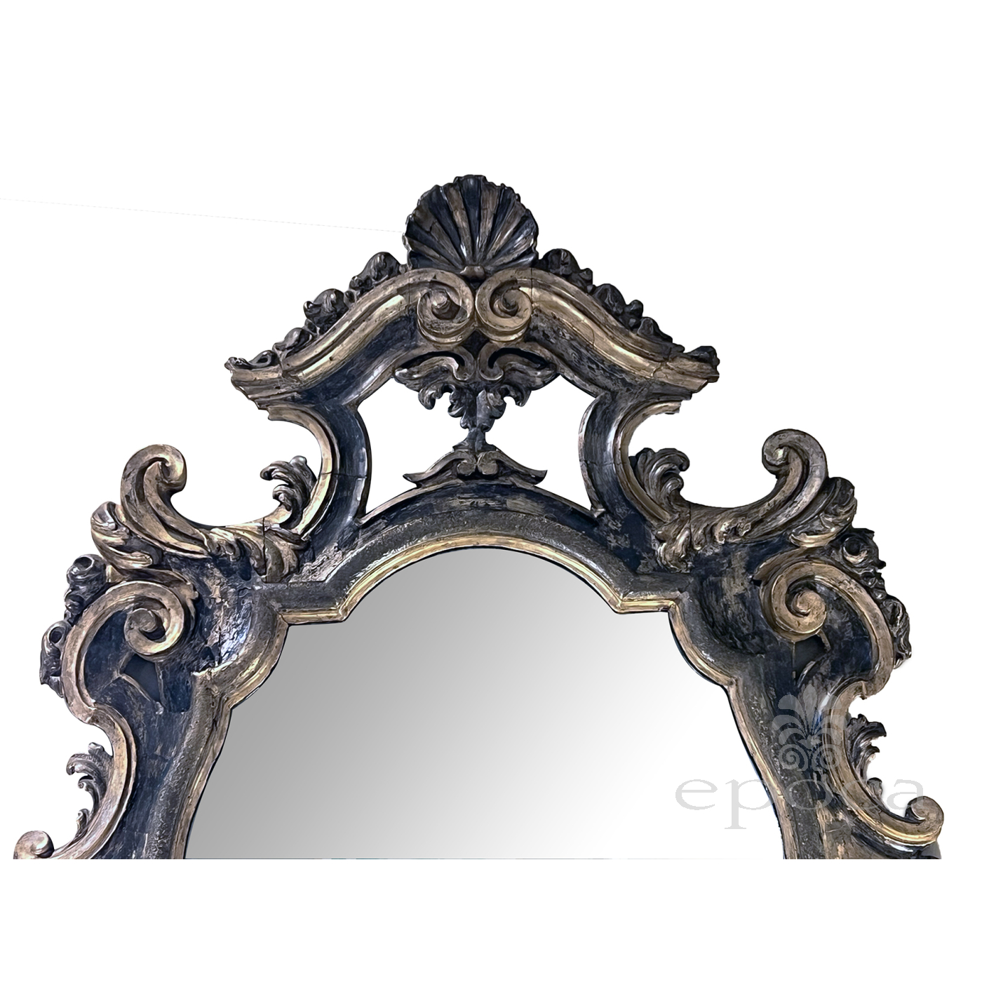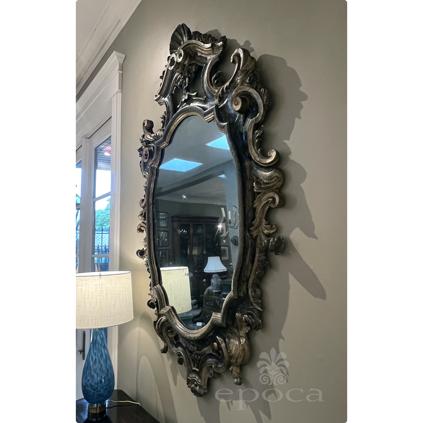 the large oval-form mirror within a well-carved pale blue and silver-gilt frame capped with a shell motif over an openwork crest; all above an exuberantly carved frame with lively C-scrolls and acanthus leaves; ex-collection Bartolomeo Rizzo, Palermo, Italy; good antique condition with some replacements, elements re-glued; professionally restored with refreshed surface; nice overall even wear and rubbing to surface; later plate