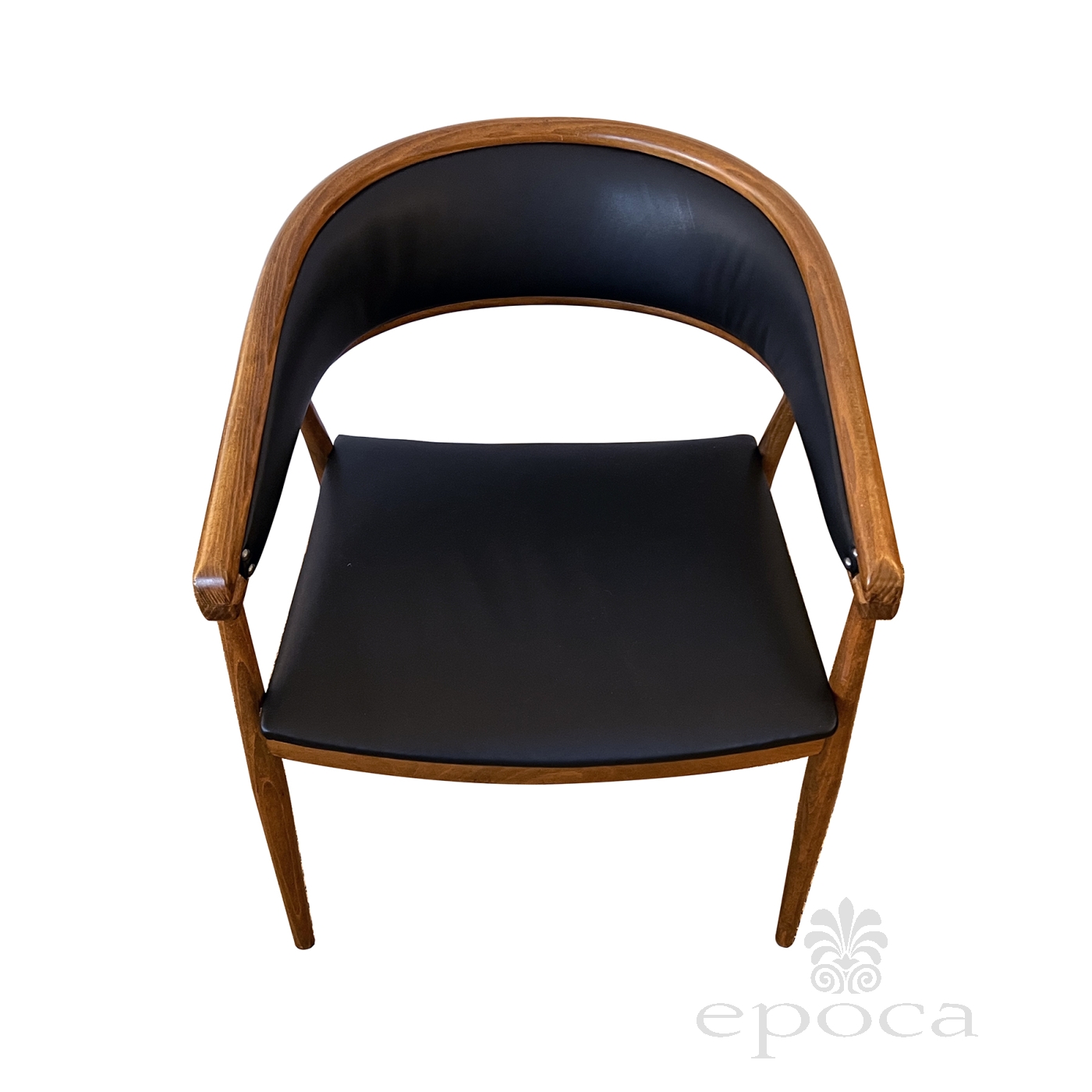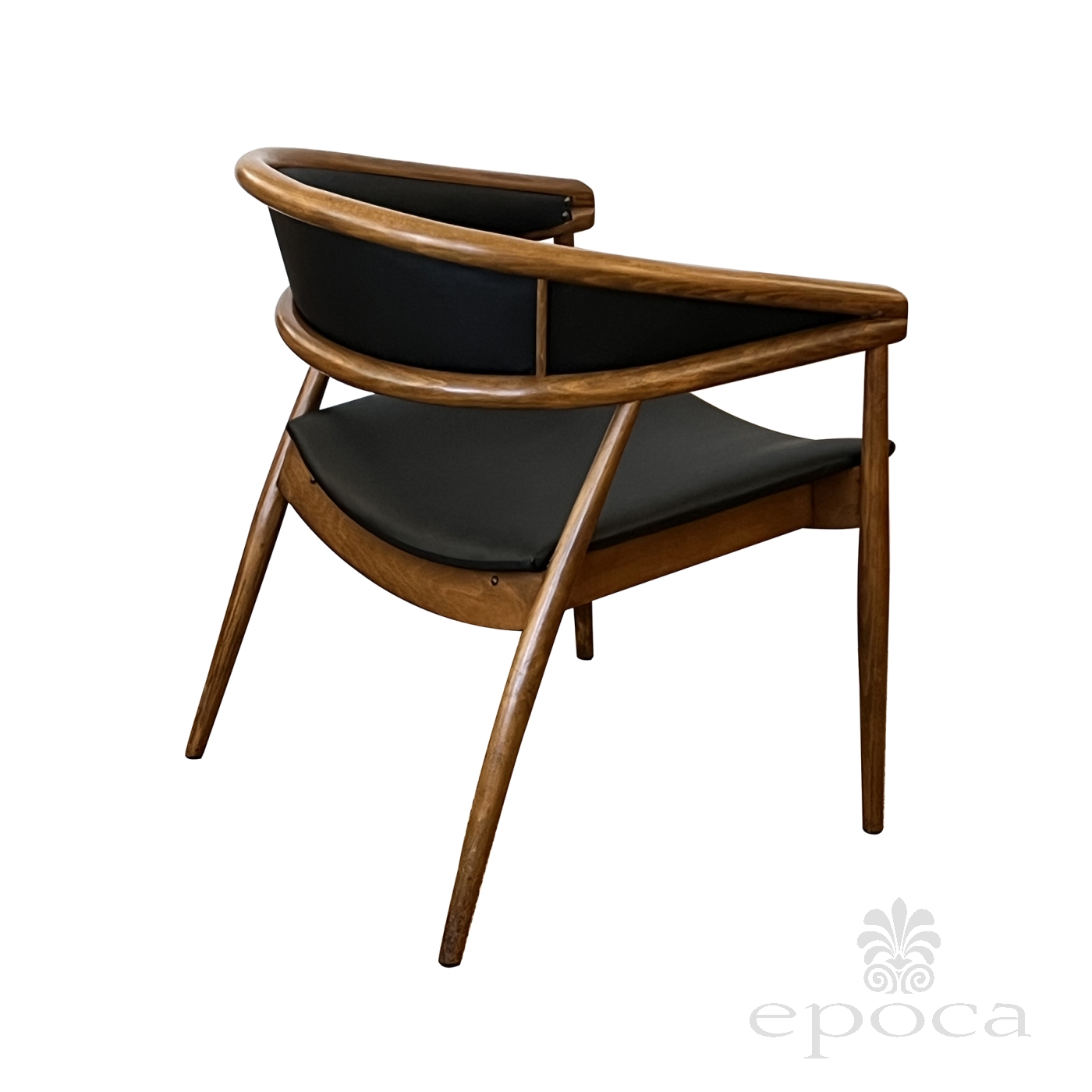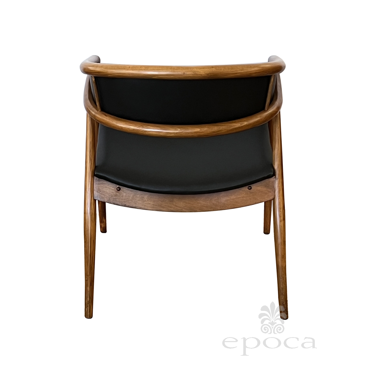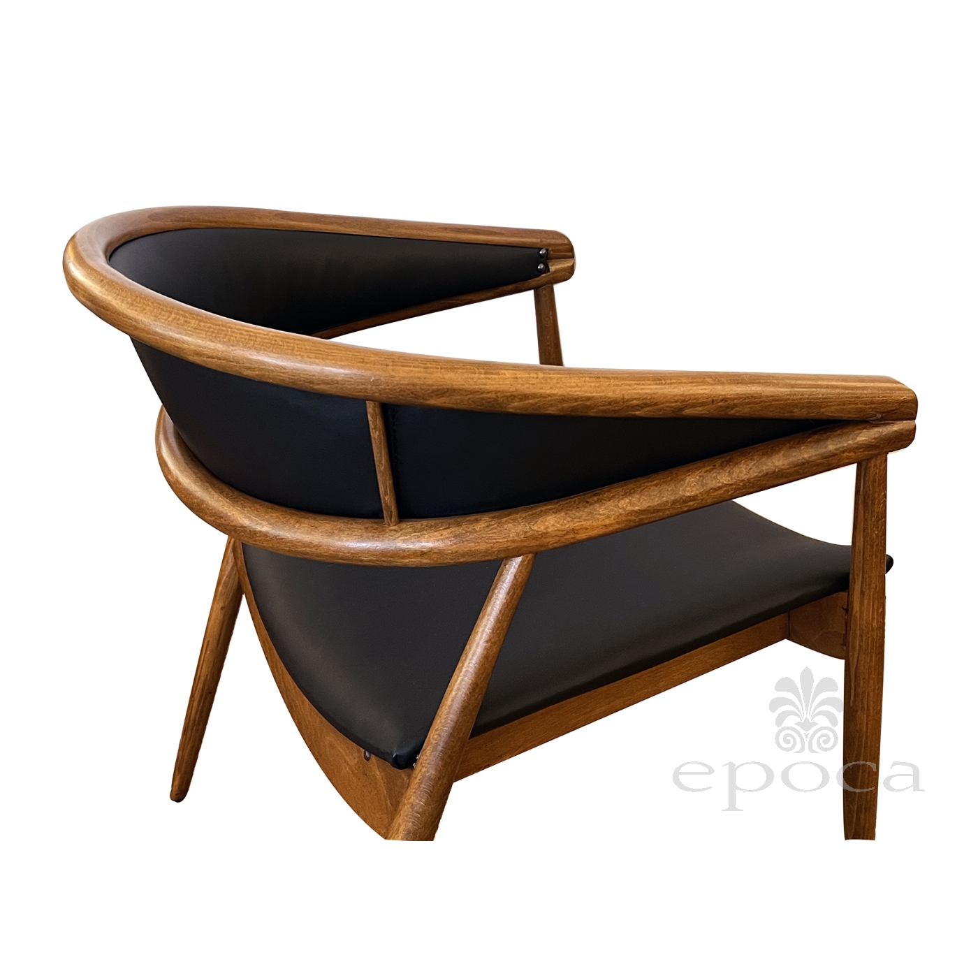 of sleek mid-century design with an elegant profile, James Mont's King Cole chair was deigned for one of his most notable commissions, the King Cole Penthouse in Miami; having a beech bentwood openwork barrel back with sloping arms all above a saddle seat and conforming apron; raised on tapering turned supports; professionally restored and structurally sound; refinished and reupholstered in black leather