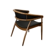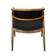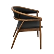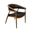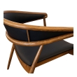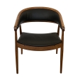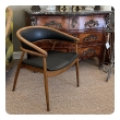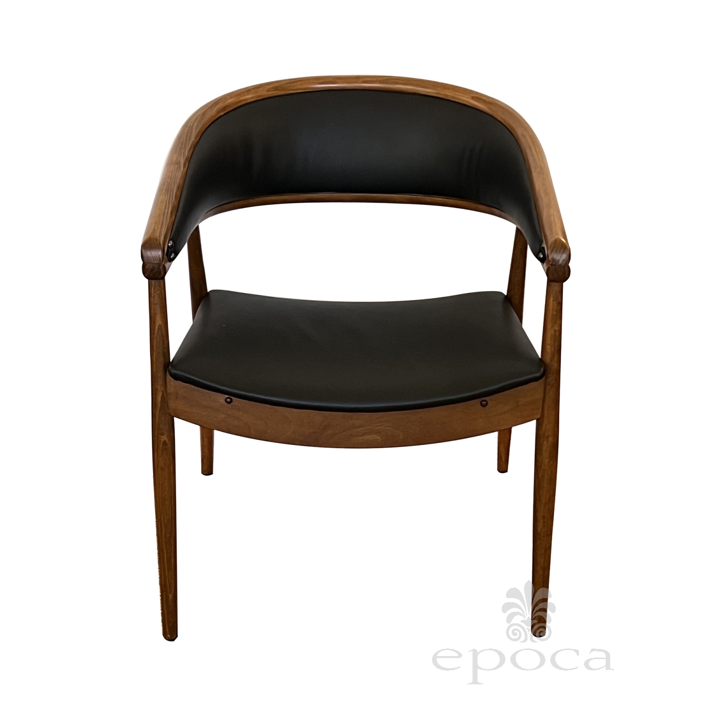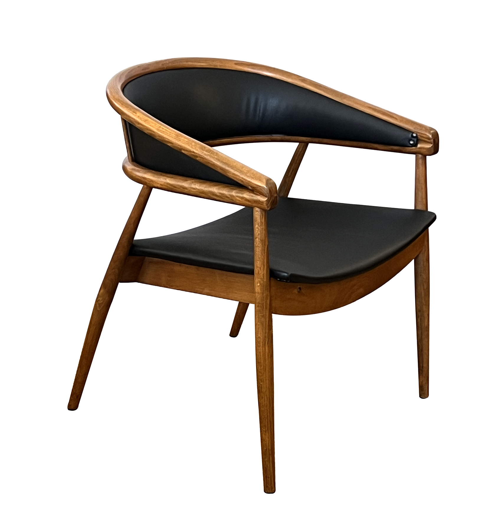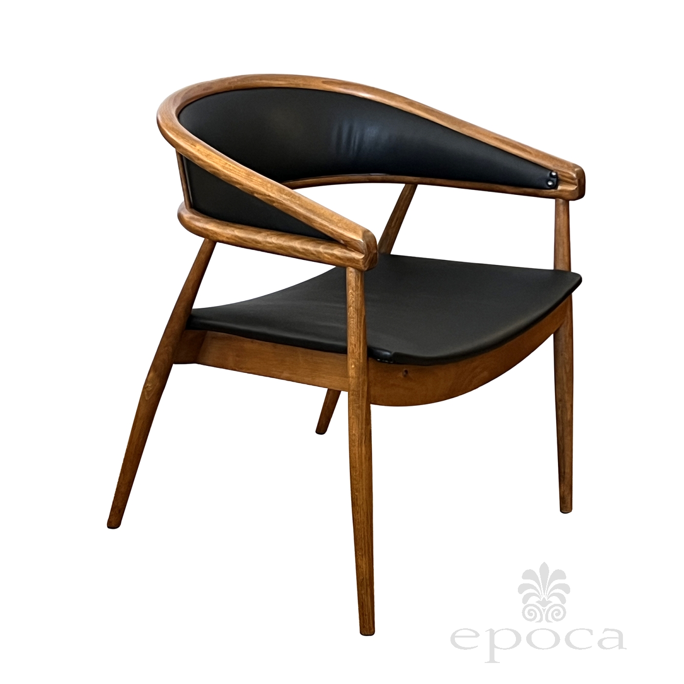 of sleek mid-century design with an elegant profile, James Mont's King Cole chair was deigned for one of his most notable commissions, the King Cole Penthouse in Miami; having a beech bentwood openwork barrel back with sloping arms all above a saddle seat and conforming apron; raised on tapering turned supports; professionally restored and structurally sound; refinished and reupholstered in black leather