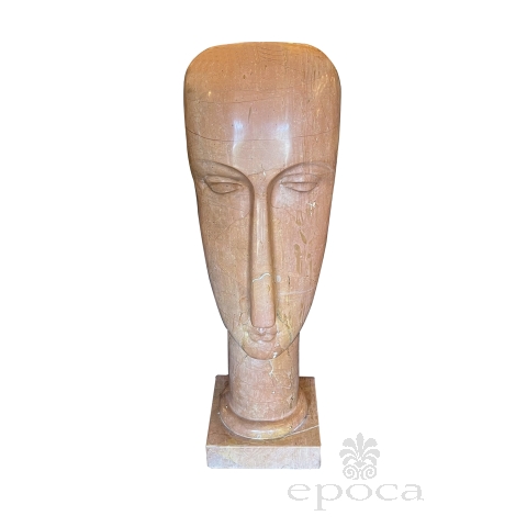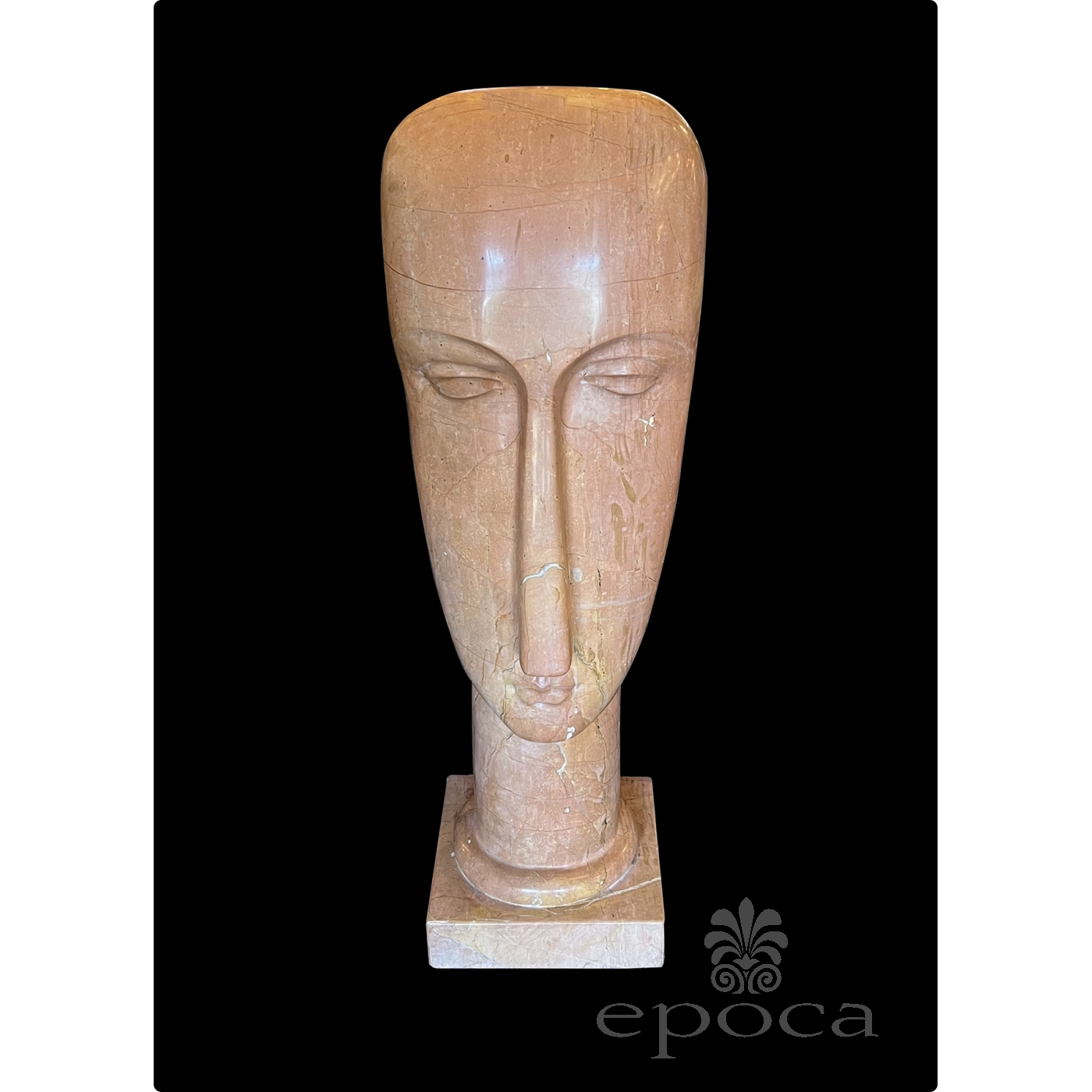 characterized by its simplified, geometric forms, elongated facial features, and mask-like appearance it features stylized marquis-shaped eyes, a prominent nose forming a blade-like shape, and a small mouth, all over a long, cylindrical neck and square plinth; finely carved and finished from a block of rosso allicante marble; overall even wear with chipping to base