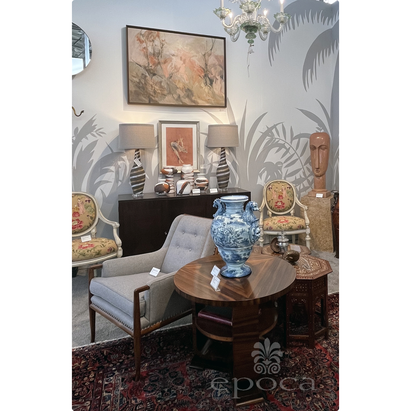 oil on canvas signed 'RM Burrer '64' lower right and verso with title 'Trees in October'; the large light-filled canvas with its spontaneous and quick brush strokes depicting an abstract October forest with splashes of fall colors and sunlight against the muted tones of the bare trees; dimensions: OH 37.5" sight: 35.5" OW: 49.25 sight: 47.5"; professionally cleaned and relined; good vintage condition with new walnut frame