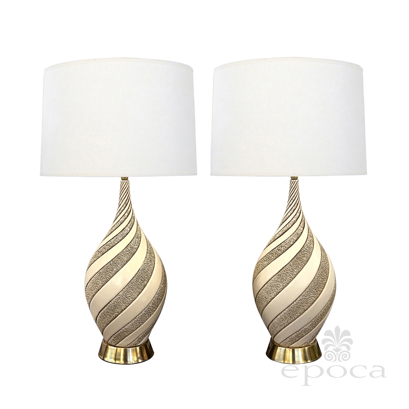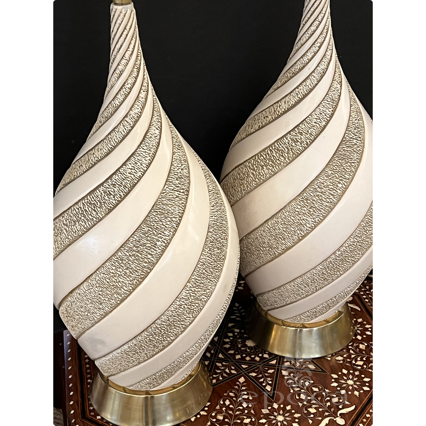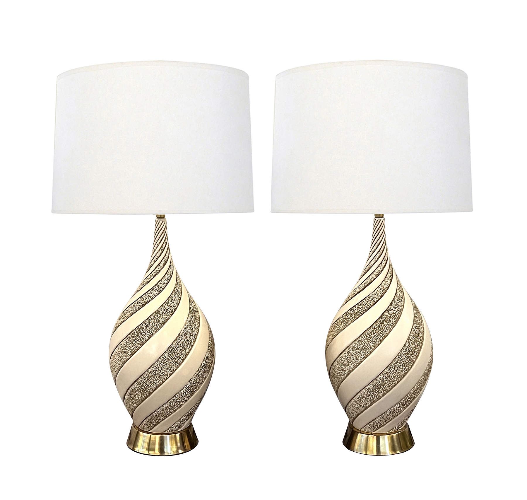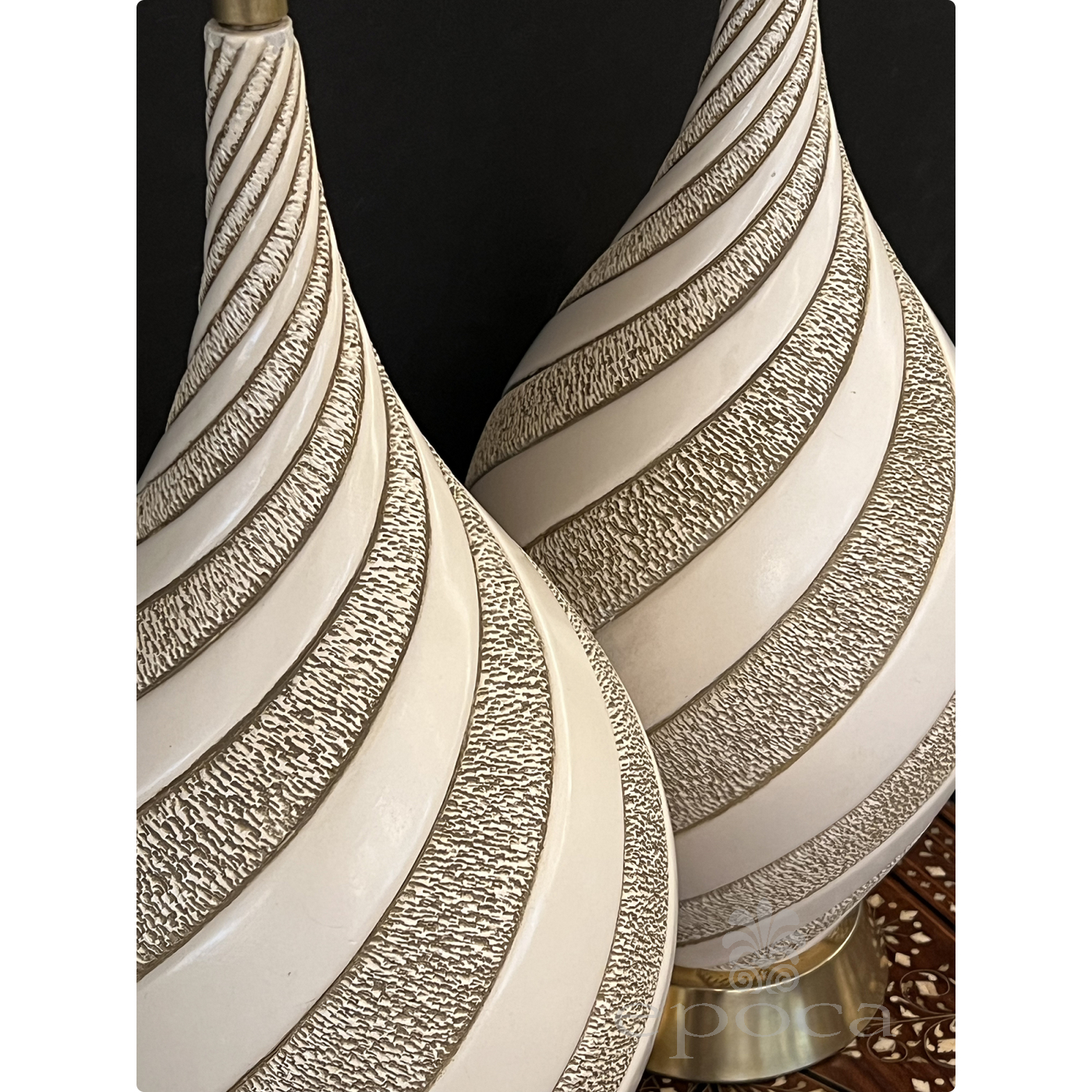 Signed Large Pair 1960s Ivory Glazed Spiral Lamps by Quartite Creative Corp