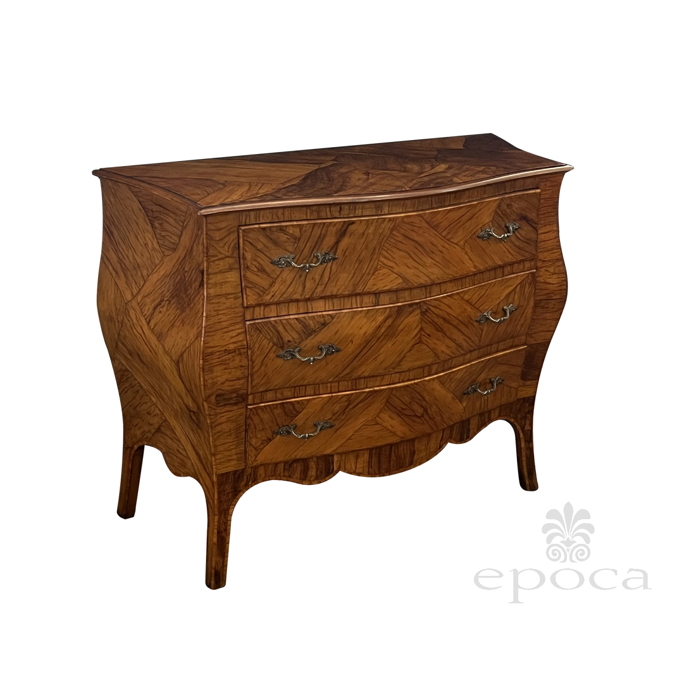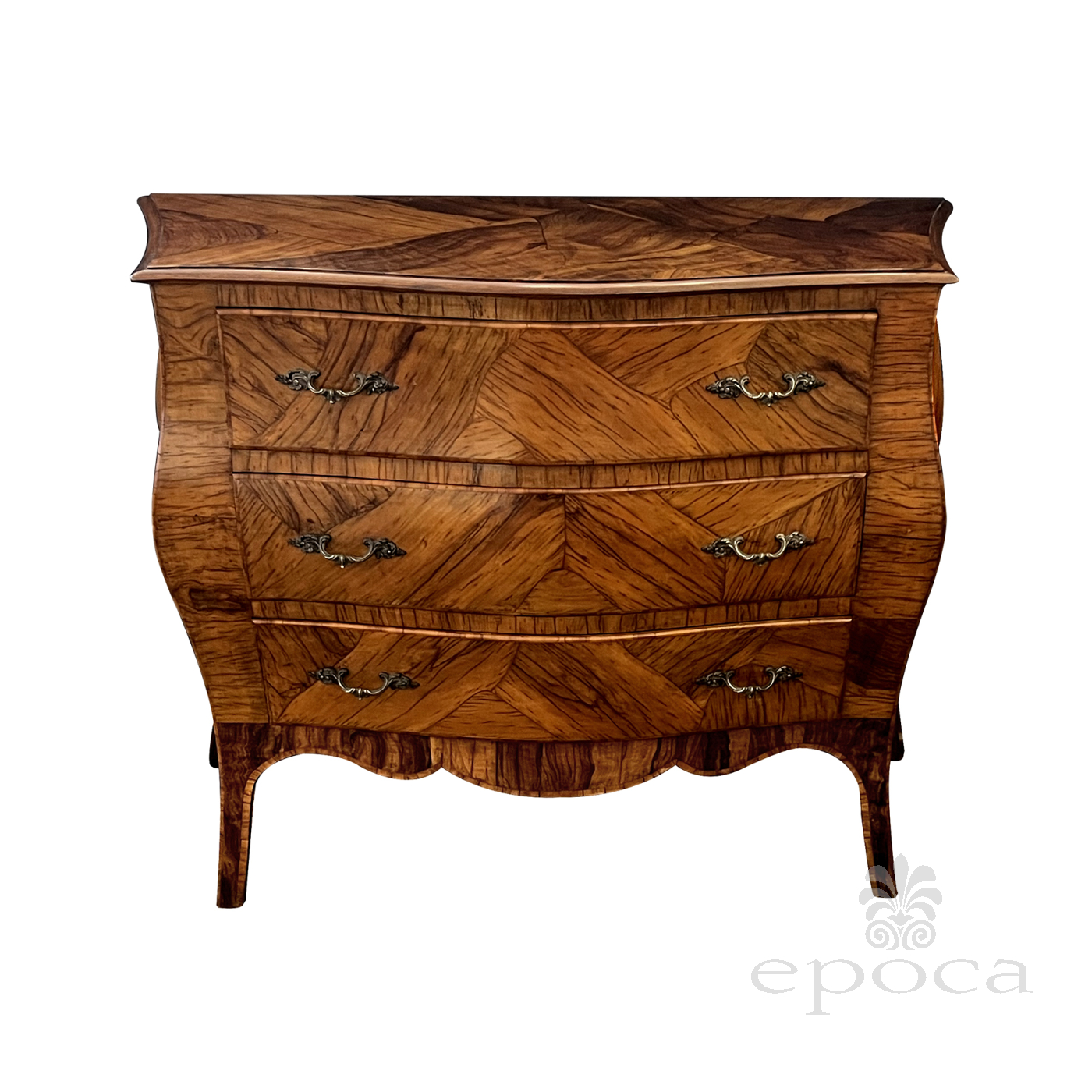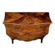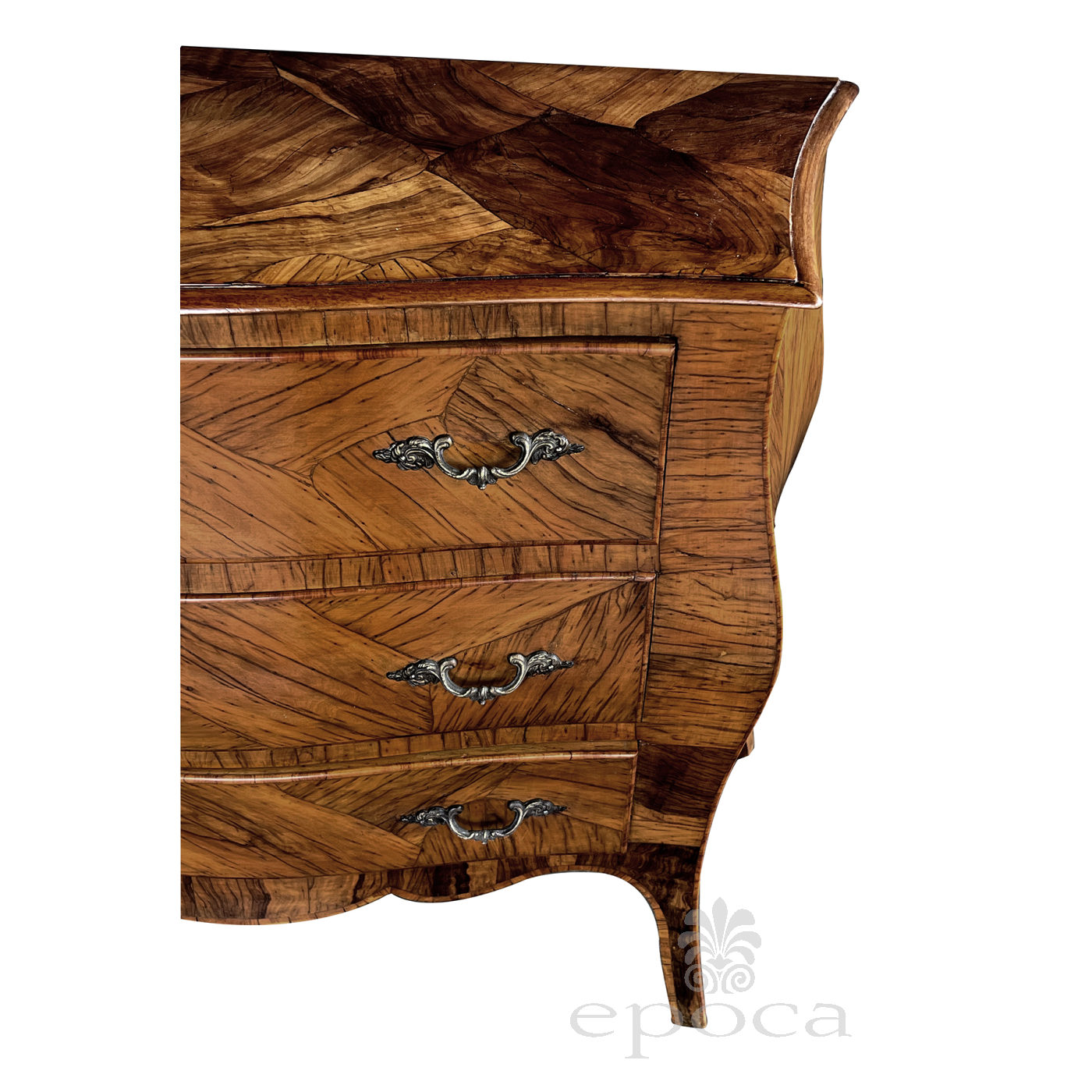 the mid-century chest in the rococo taste having a shaped top above a conforming bombé-form case with three drawers featuring ornate bronze pulls; over a scalloped apron all raised on splayed supports; the whole in a well-figured and richly patinated olivewood veneer; 'Made in Italy' label affixed to back; good vintage condition; professionally refinished